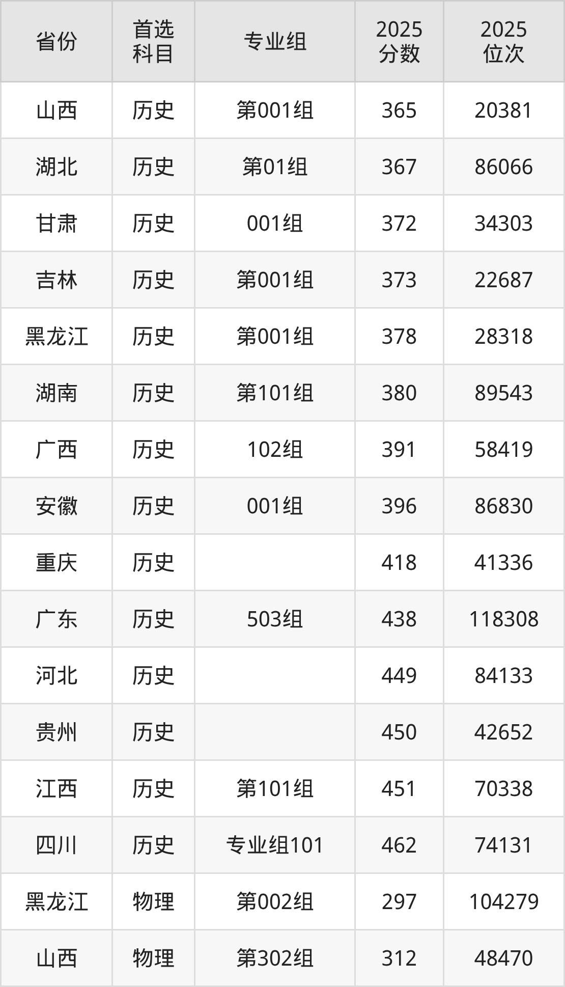 历史类最低分对应地区为山西(第001组),录取位次为20381,超专科线265分;最高分对应地区为四川(专业组101),录取位次为74131,超专科线312分。