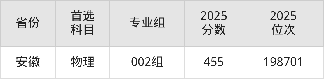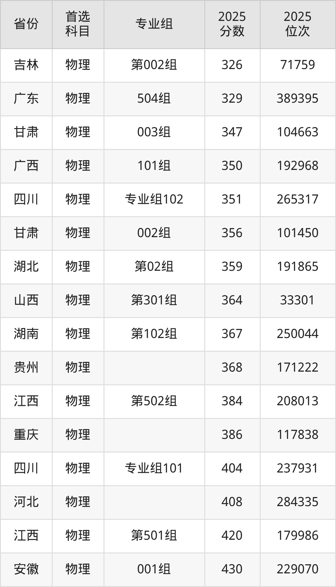物理类最低分对应地区为黑龙江(第002组),录取位次为104279,超专科线137分;最高分对应地区为安徽(002组),录取位次为198701,超专科线255分。