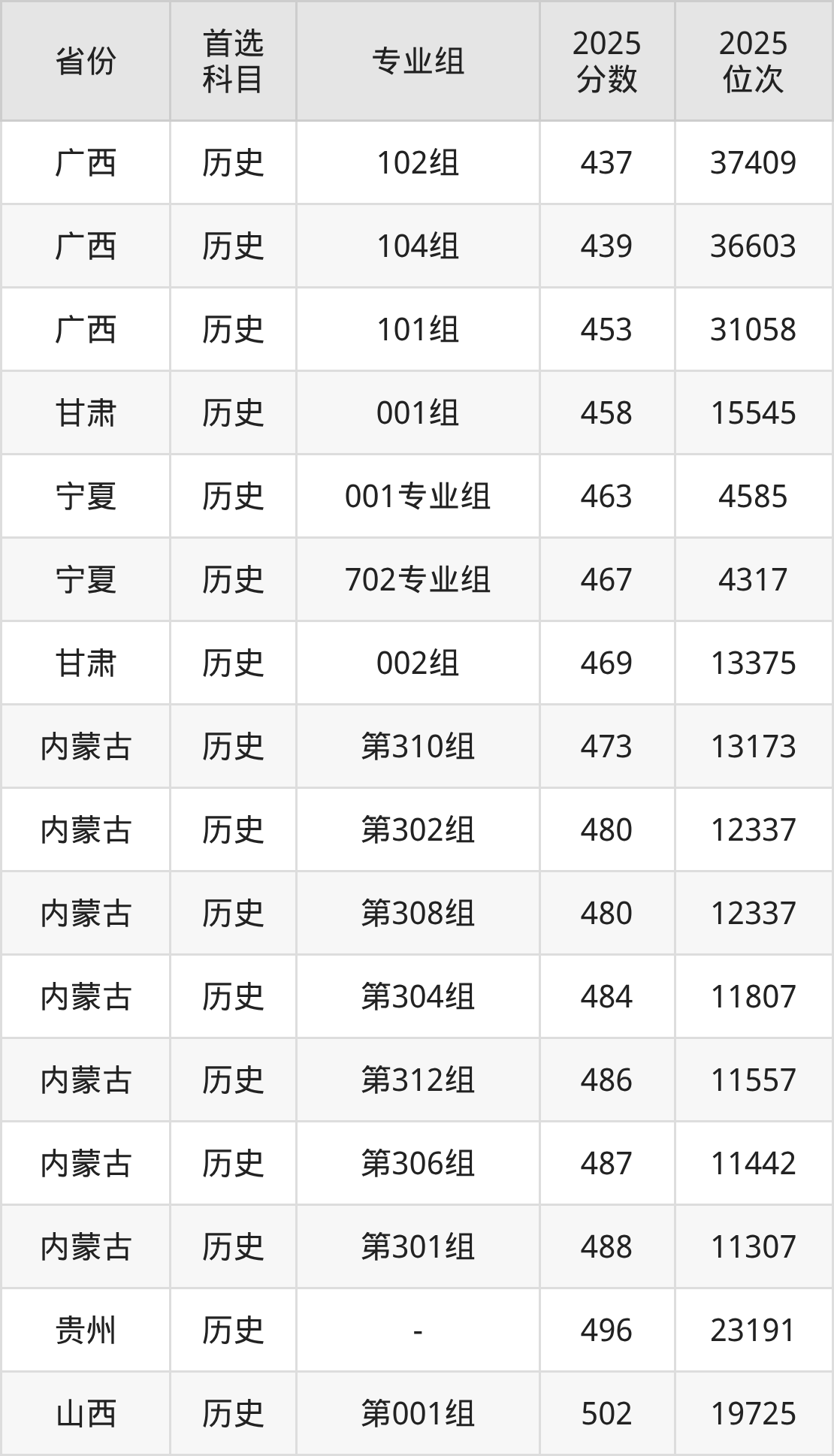 历史类:第301组488分、11307名,第302组480分、12337名,第304组484分、11807名,第306组487分、11442名,第308组480分、12337名,第310组473分、13173名,第312组486分、11557名;