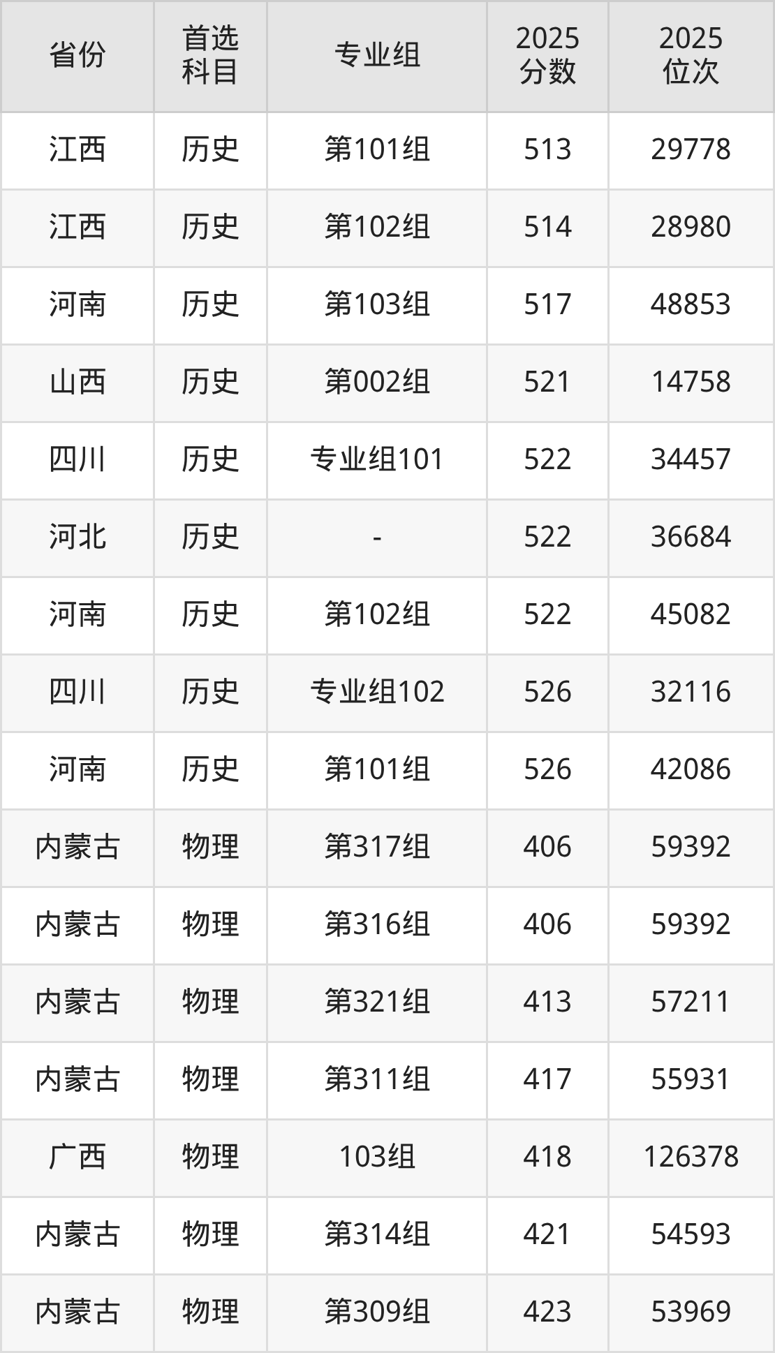 物理类:第303组429分、51996名,第305组450分、45095名,第309组423分、53969名,第311组417分、55931名,第313组434分、50339名,第314组421分、54593名,第315组427分、52652名,第316组406分、59392名,第317组406分、59392名,第318组455分、43491名,第319组432分、50996名,第321组413分、57211名;