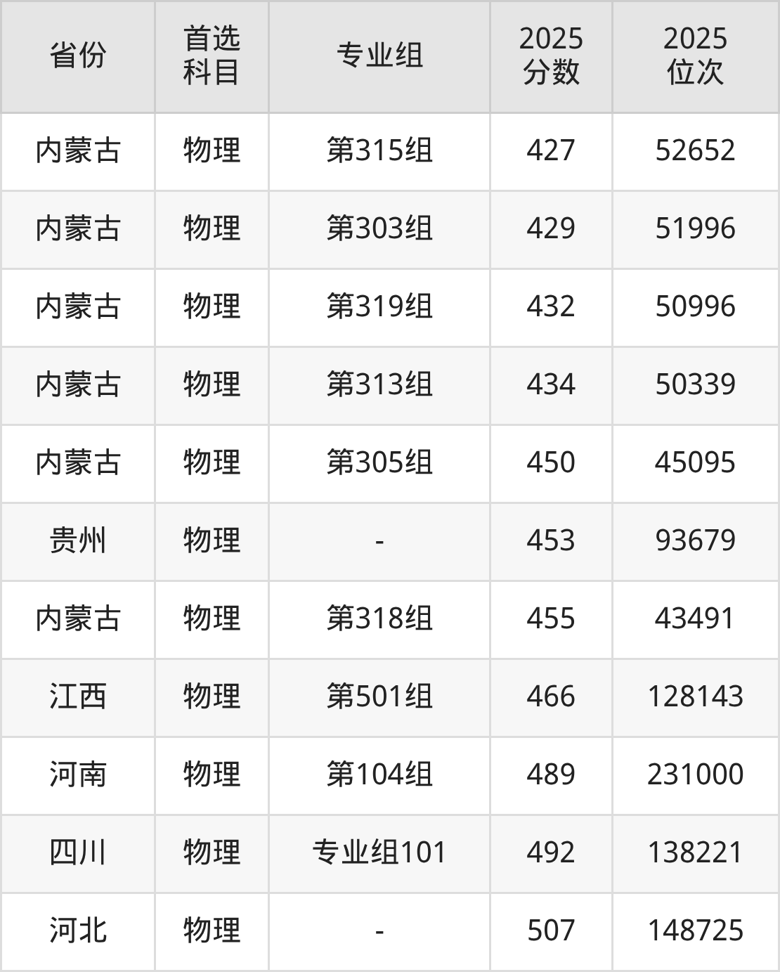 物理类最低分对应地区为内蒙古(第317组),录取位次为59392,超本科线31分;最高分对应地区为河北,录取位次为148725。