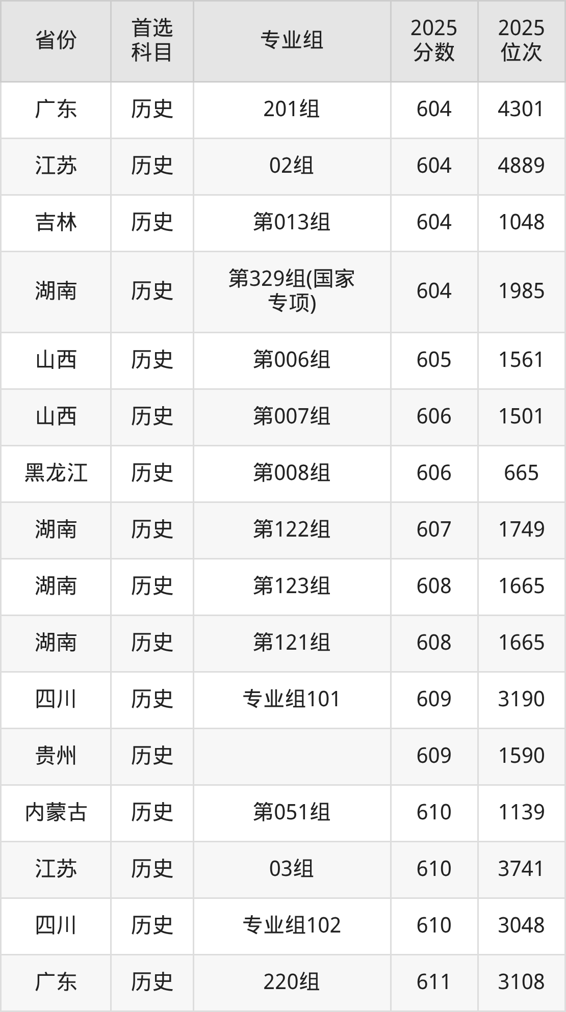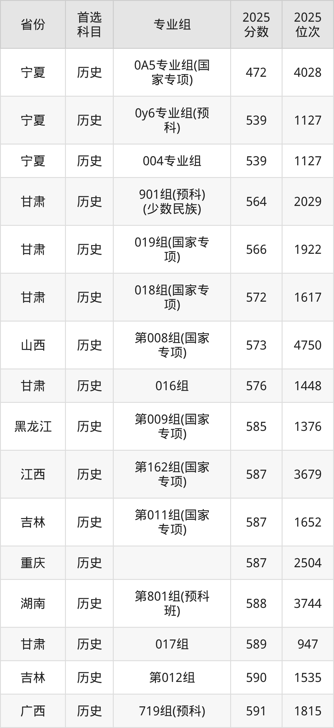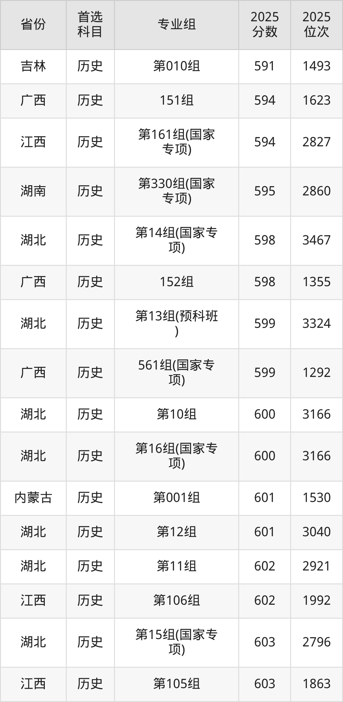 历史类:第04组(预科班)591分、3043名,第05组590分、3161名,第06组(国家专项)598分、2351名,第07组608分、1533名,第08组597分、2437名,第09组(国家专项)595分、2643名,第10组611分、1348名,第11组606分、1695名,第12组(国家专项)593分、2844名,第13组606分、1695名;