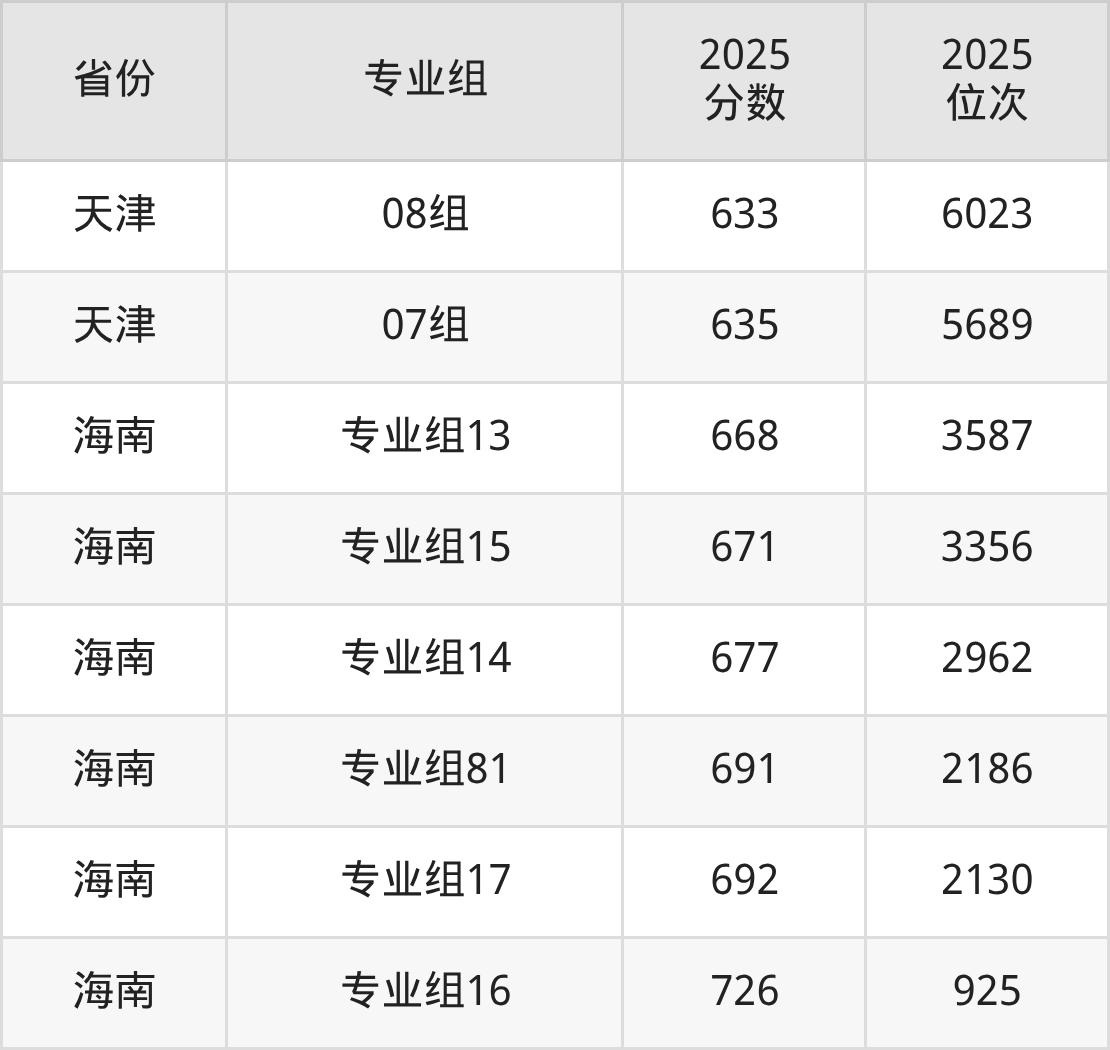 最低分对应地区为上海(03组),录取位次为15514,超本科线129分;最高分对应地区为海南(专业组16),录取位次为925,超本科线246分。