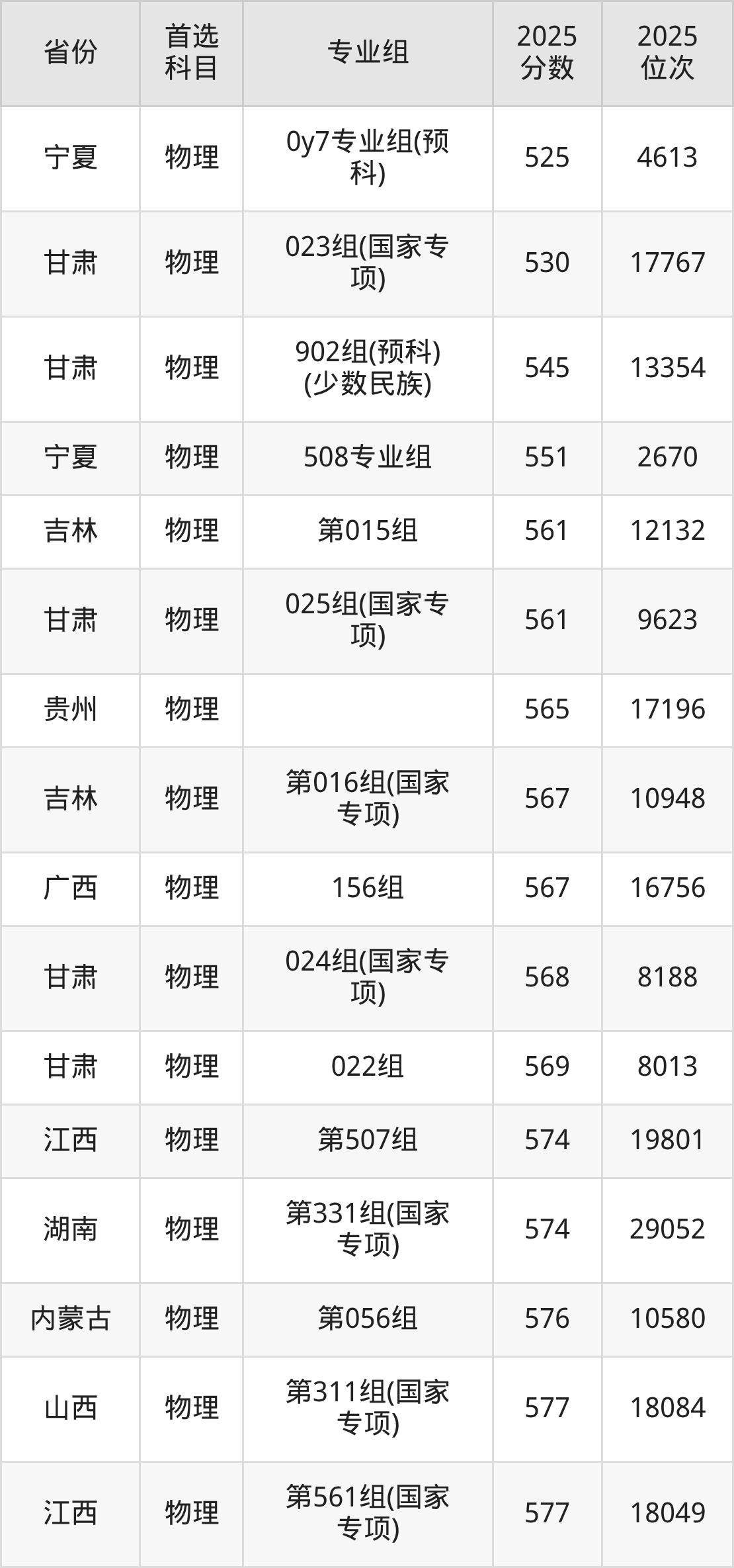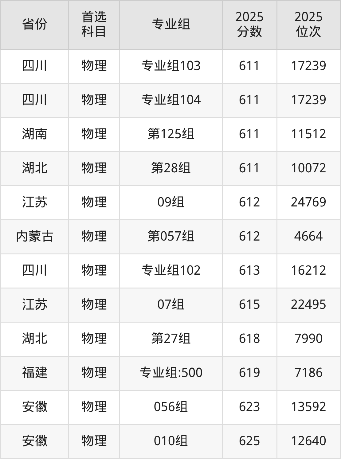 物理类:第16组616分、12783名,第17组604分、17557名,第18组(国家专项)620分、11397名,第19组(国家专项)615分、13191名,第20组629分、8494名,第21组624分、10078名,第22组619分、11725名,第23组(国家专项)614分、13565名,第24组635分、6817名,第25组615分、13191名,第26组634分、7081名,第27组622分、10738名,第28组630分、8188名。
