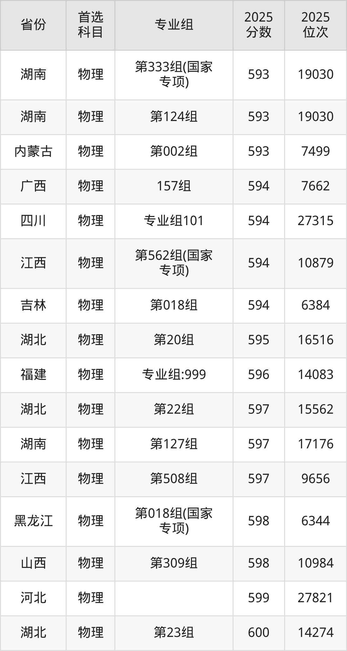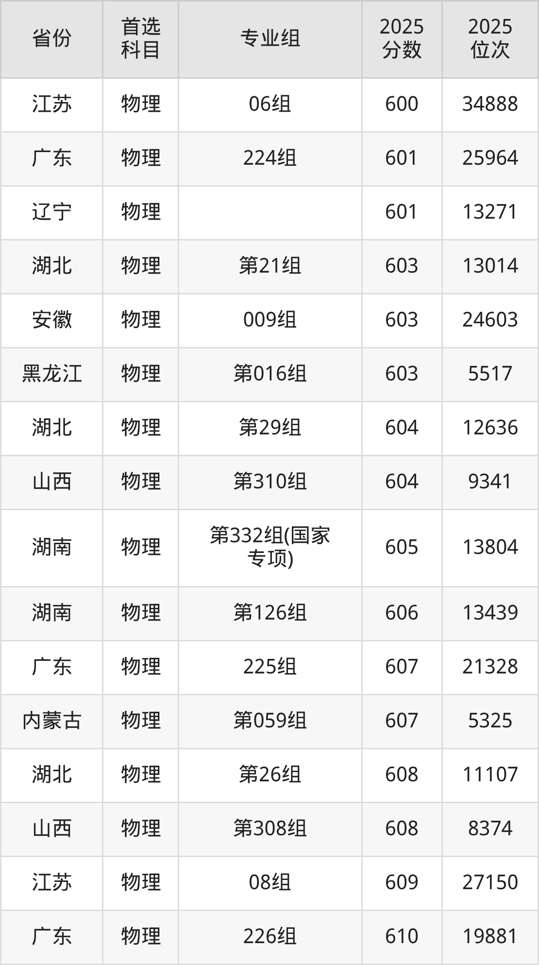 物理类:第14组(预科班)602分、16685名,第15组601分、17139名,第16组(国家专项)602分、16685名,第17组611分、12932名,第18组610分、13315名,第19组(国家专项)608分、14116名,第20组623分、8760名,第21组615分、11395名,第22组620分、9701名;