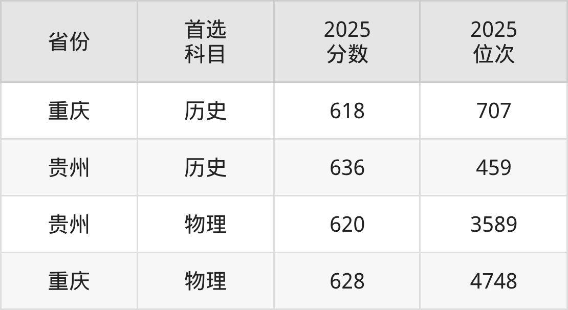 历史类最低分对应地区为重庆,录取位次为707;最高分对应地区为贵州,录取位次为459,超本科线178分。