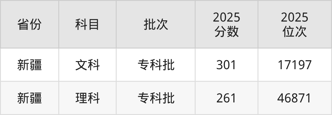 文科最低分对应地区为新疆,录取位次为17197,超专科线161分。