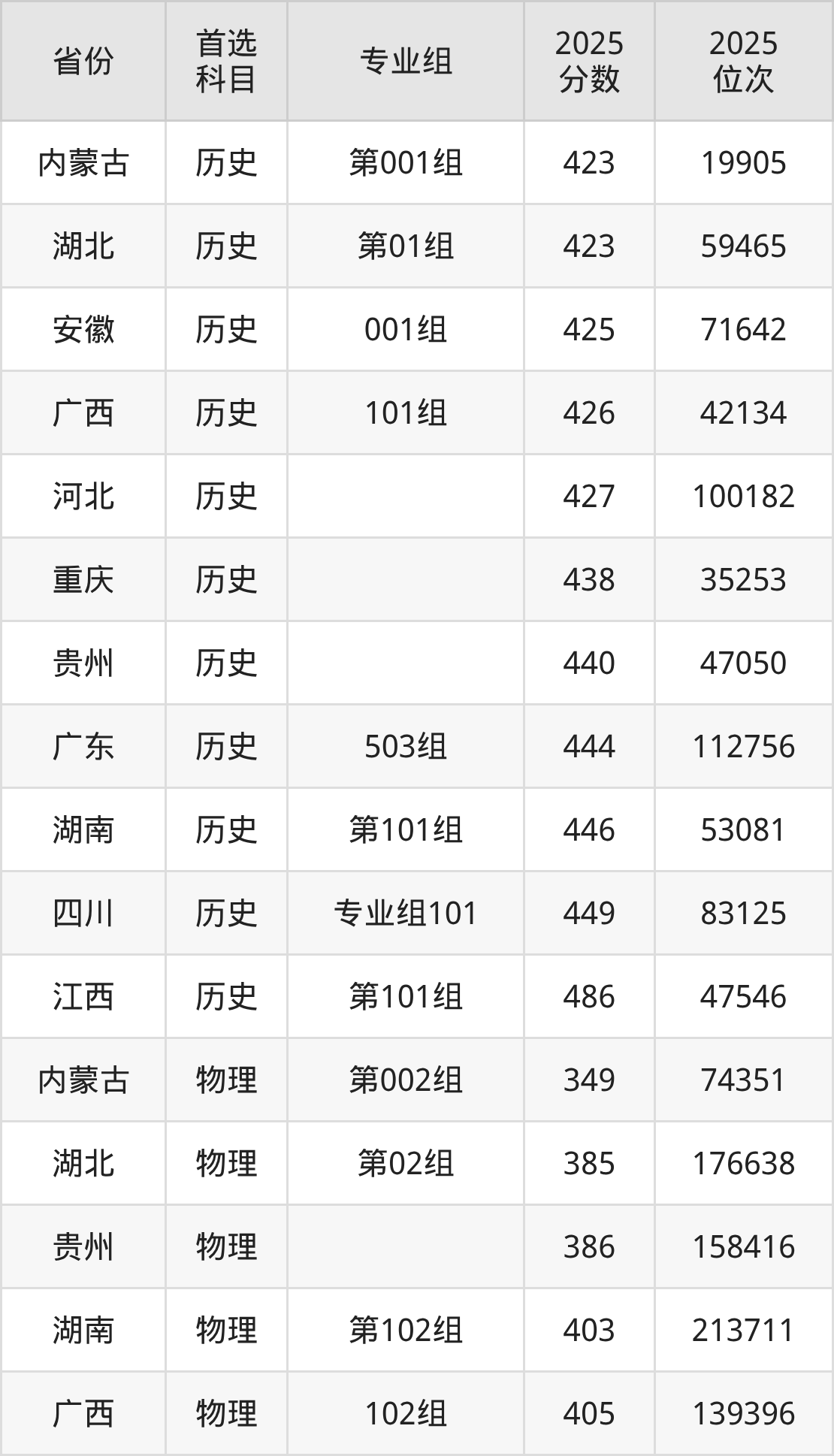 历史类最低分对应地区为内蒙古(第001组),录取位次为19905,超专科线263分;最高分对应地区为江西(第101组),录取位次为47546,超专科线196分。