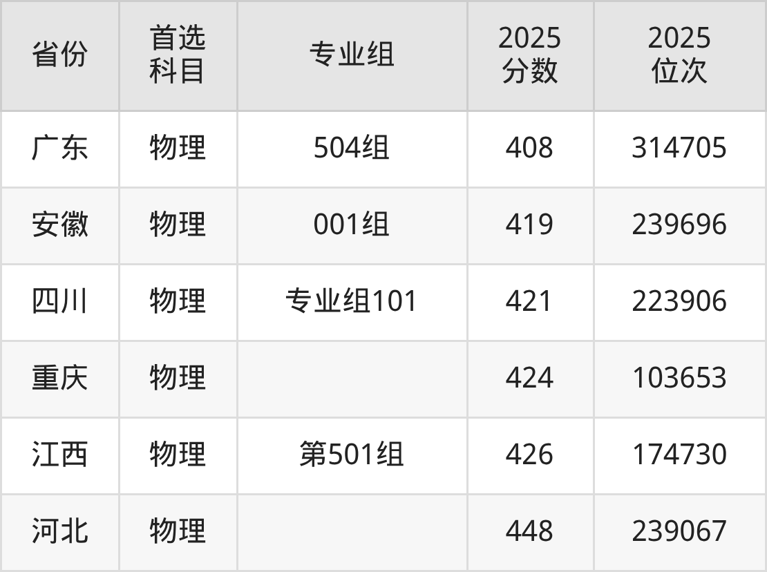 物理类最低分对应地区为内蒙古(第002组),录取位次为74351,超专科线189分;最高分对应地区为河北,录取位次为239067,超专科线248分。