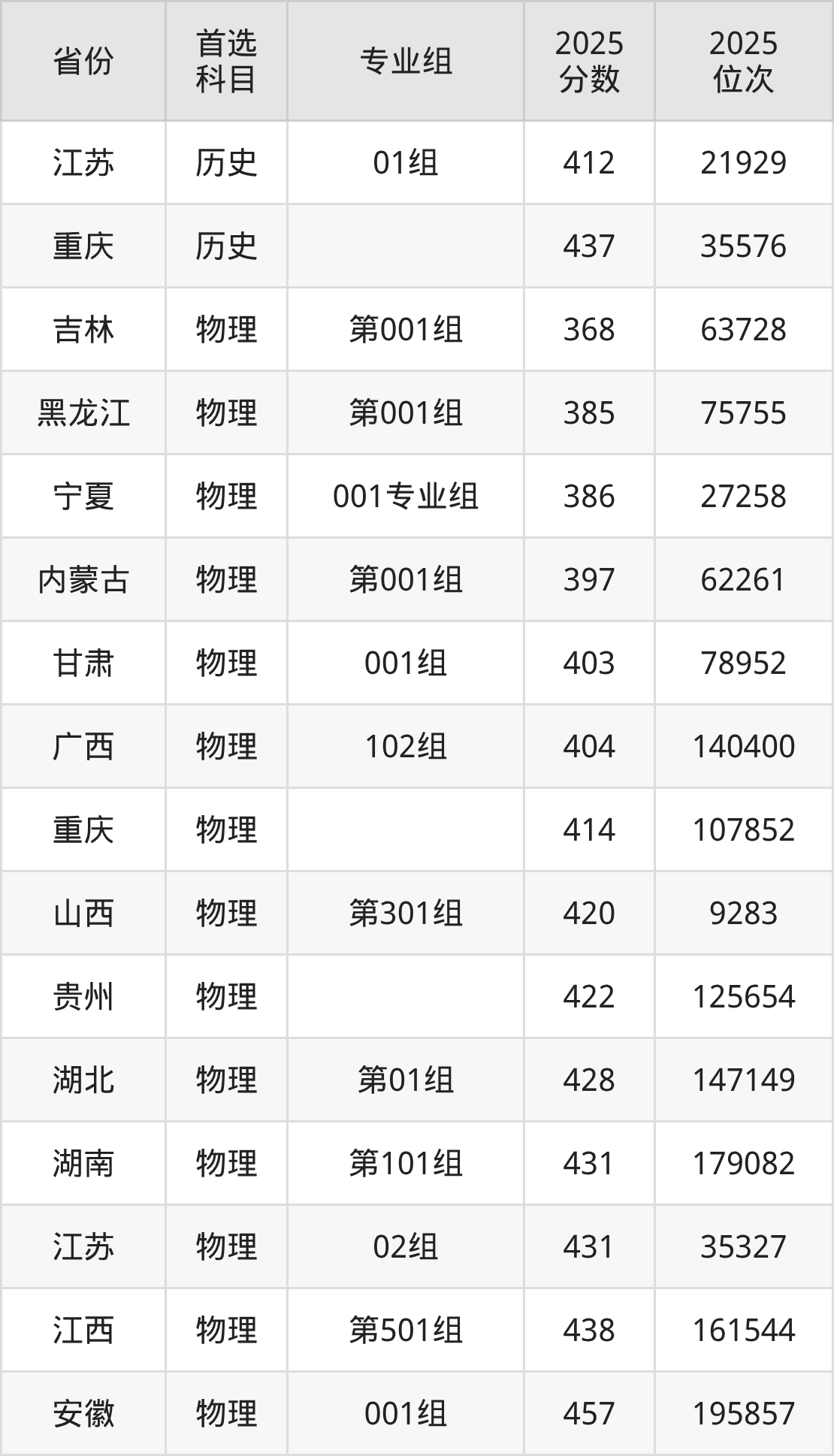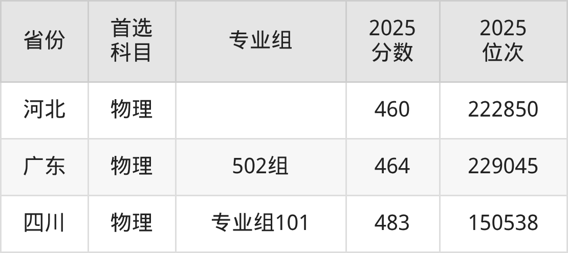 物理类最低分对应地区为吉林(第001组),录取位次为63728,超专科线208分;最高分对应地区为四川(专业组101),录取位次为150538,超专科线333分。