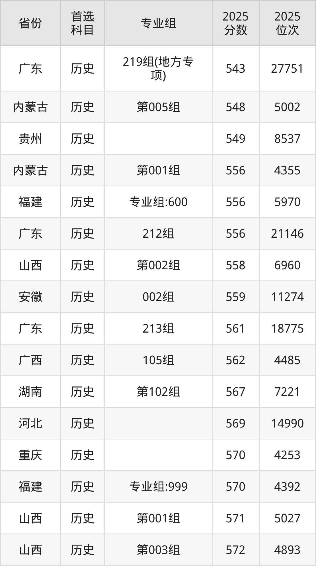 历史类:209组619分、2062名,210组602分、4653名,211组600分、5280名,212组556分、21146名,213组561分、18775名,218组(地方专项)584分、9758名,219组(地方专项)543分、27751名;
