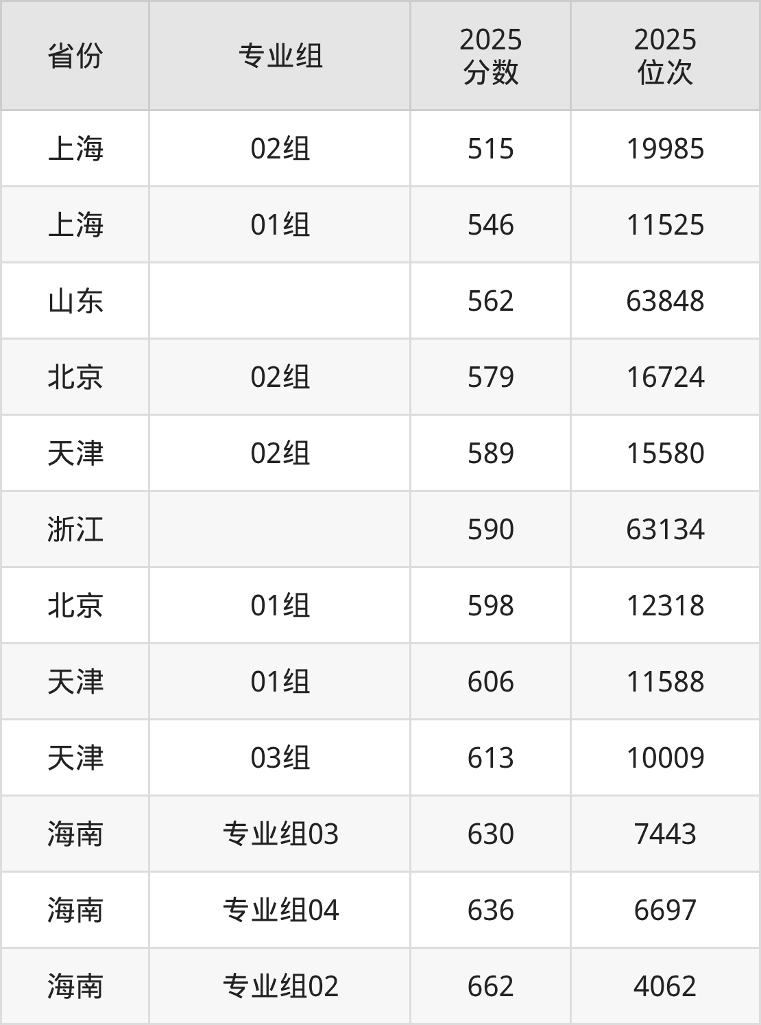 最低分对应地区为上海(02组),录取位次为19985,超本科线113分;最高分对应地区为海南(专业组02),录取位次为4062,超本科线182分。