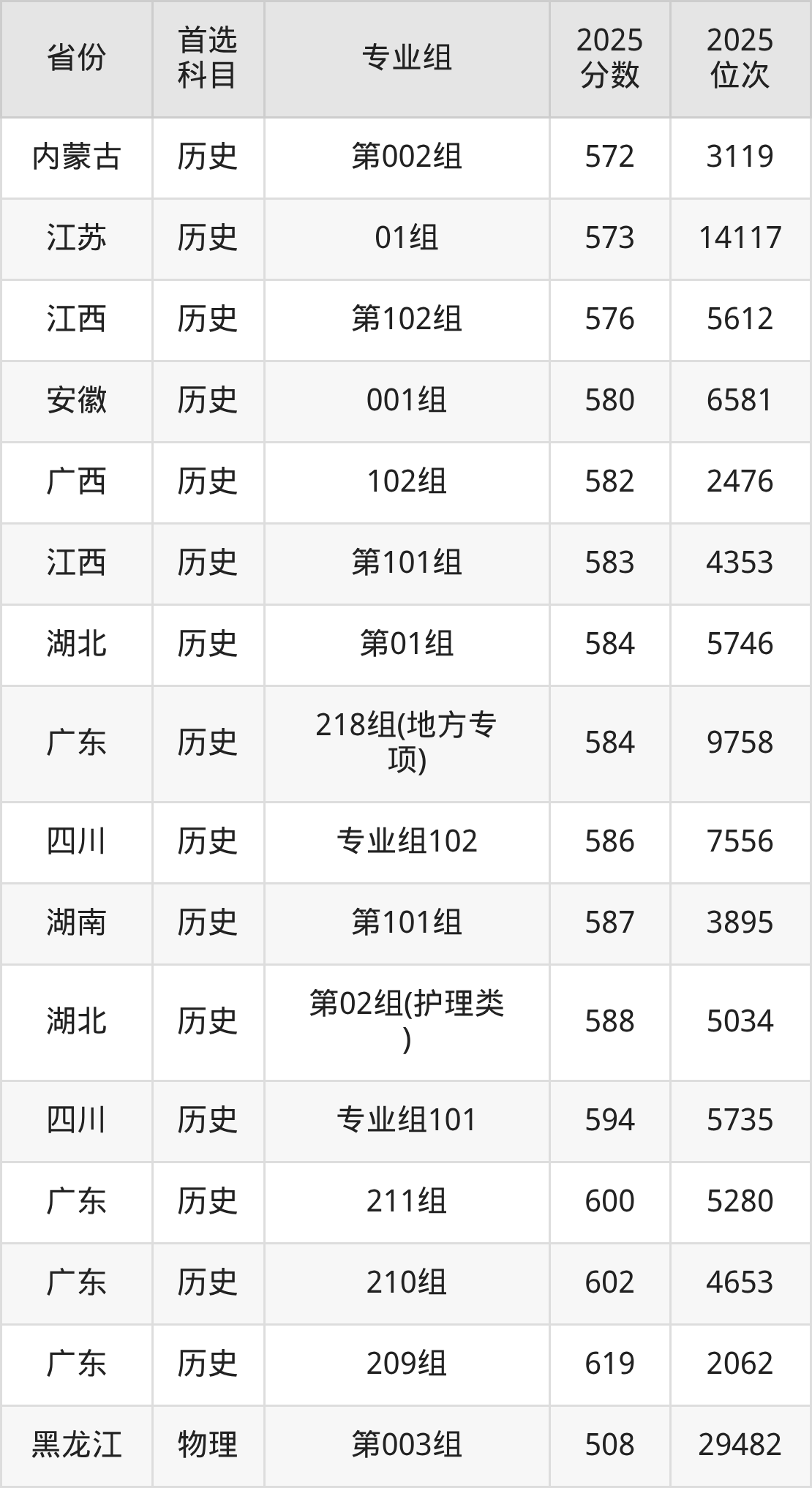 历史类:001组(地方免费医学生)586分、5662名,002组(地方免费医学生)583分、6234名,003组(地方免费医学生)560分、12053名,004组(地方免费医学生)564分、10879名,005组(地方免费医学生)570分、9219名,006组(地方免费医学生)564分、10879名,007组(地方免费医学生)601分、3267名,008组(地方免费医学生)566分、10297名,009组(地方免费医学生)579分、7063名,010组(地方免费医学生)567分、10039名,011组(地方免费医学生)560分、12053名,012组(地方免费医学生)581分、6642名,013组(地方免费医学生)563分、11165名,014组(地方免费医学生)574分、8218名,015组(地方免费医学生)576分、7734名,016组(地方免费医学生)567分、10039名,017组(地方免费医学生)583分、6234名,018组(地方免费医学生)571分、8956名,019组(地方免费医学生)564分、10879名,020组(地方免费医学生)562分、11437名,209组609分、2361名,210组585分、5850名,211组540分、19275名,213组(地方专项)543分、18012名,214组(地方专项)520分、28387名;