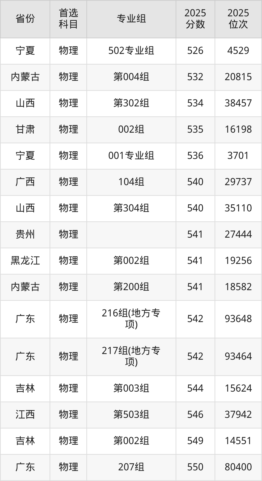 物理类最低分对应地区为黑龙江(第003组),录取位次为29482,超本科线148分;最高分对应地区为广东(201组),录取位次为23715,超本科线168分。