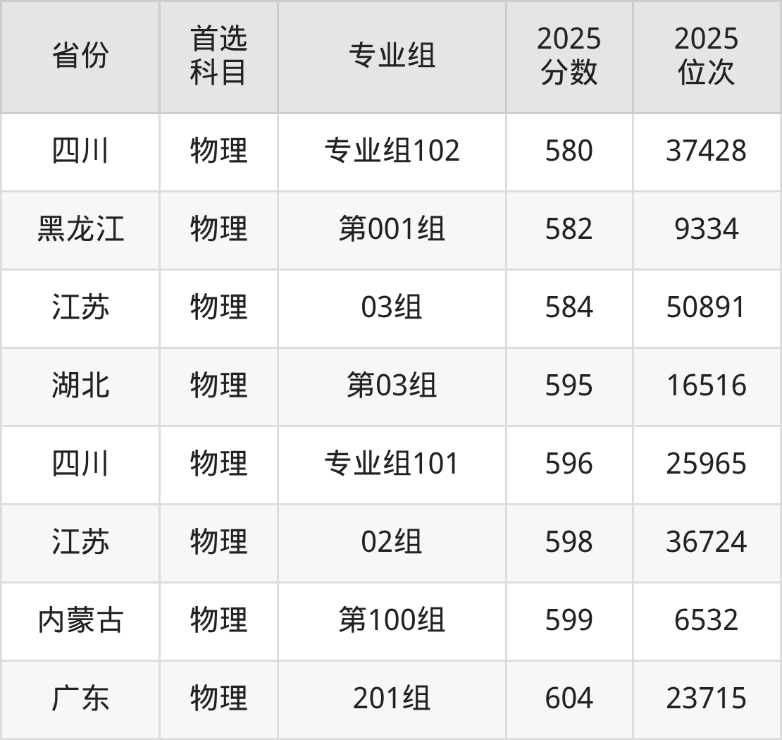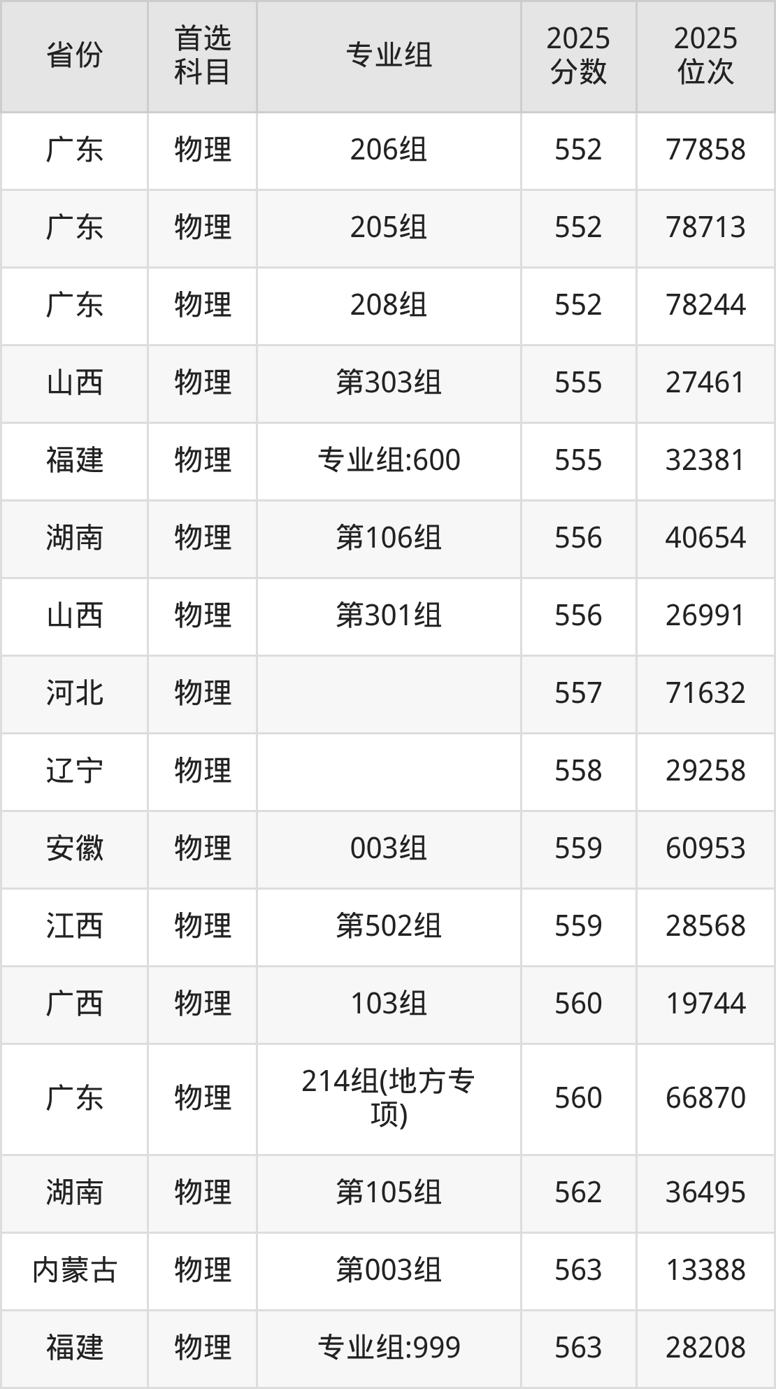 物理类:201组604分、23715名,202组575分、49432名,203组570分、54788名,204组569分、56476名,205组552分、78713名,206组552分、77858名,207组550分、80400名,208组552分、78244名,214组(地方专项)560分、66870名,215组(地方专项)565分、61026名,216组(地方专项)542分、93648名,217组(地方专项)542分、93464名;