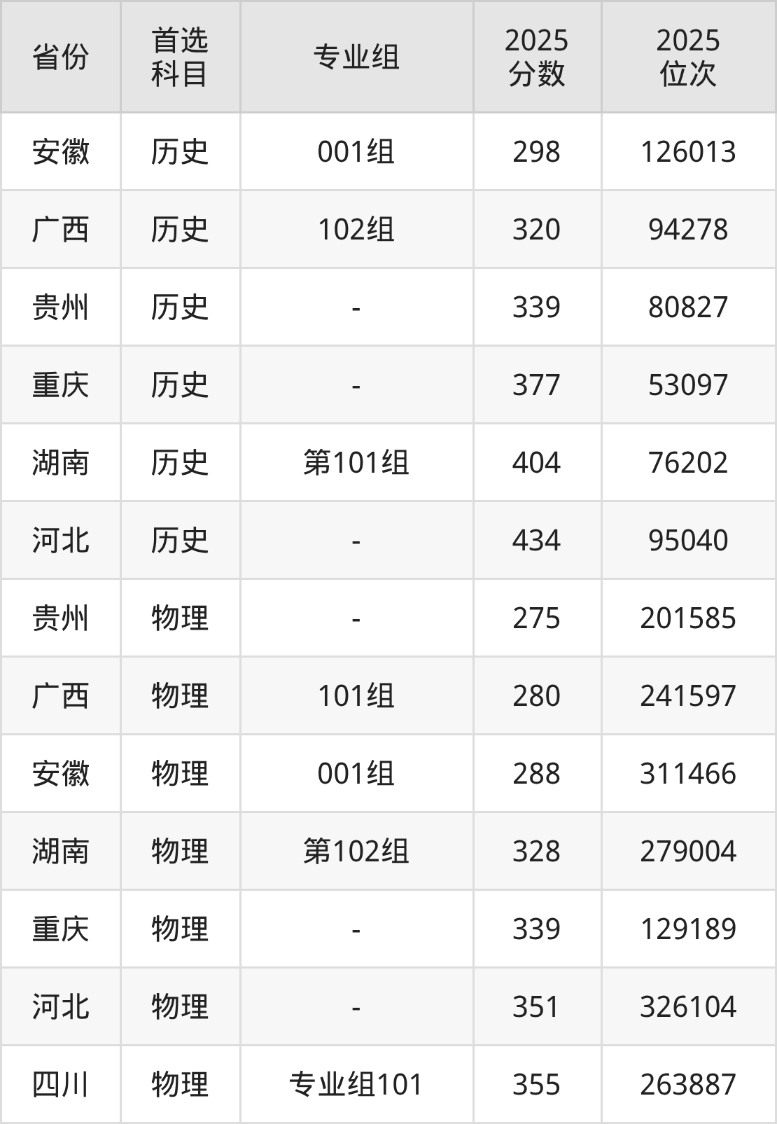物理类最低分对应地区为贵州,录取位次为201585,超专科线95分;最高分对应地区为四川(专业组101),录取位次为263887,超专科线205分。