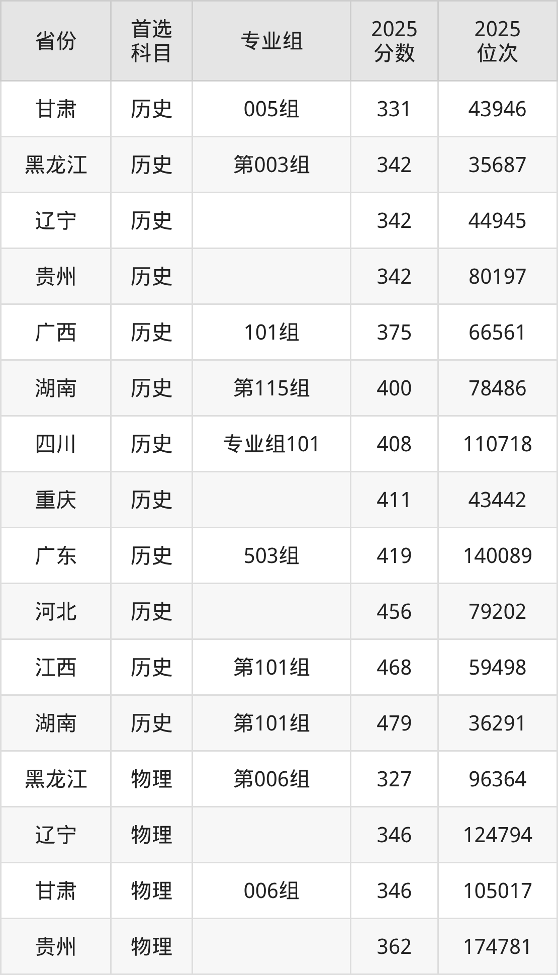 历史类最低分对应地区为甘肃(005组),录取位次为43946,超专科线171分;最高分对应地区为湖南(第101组),录取位次为36291,超本科线33分。