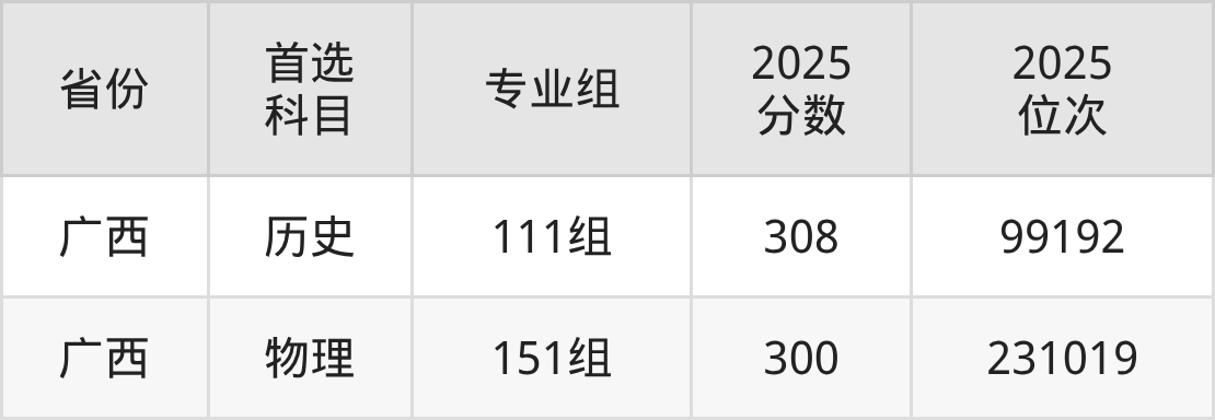 历史类最低分对应地区为广西(111组),录取位次为99192,超专科线108分。