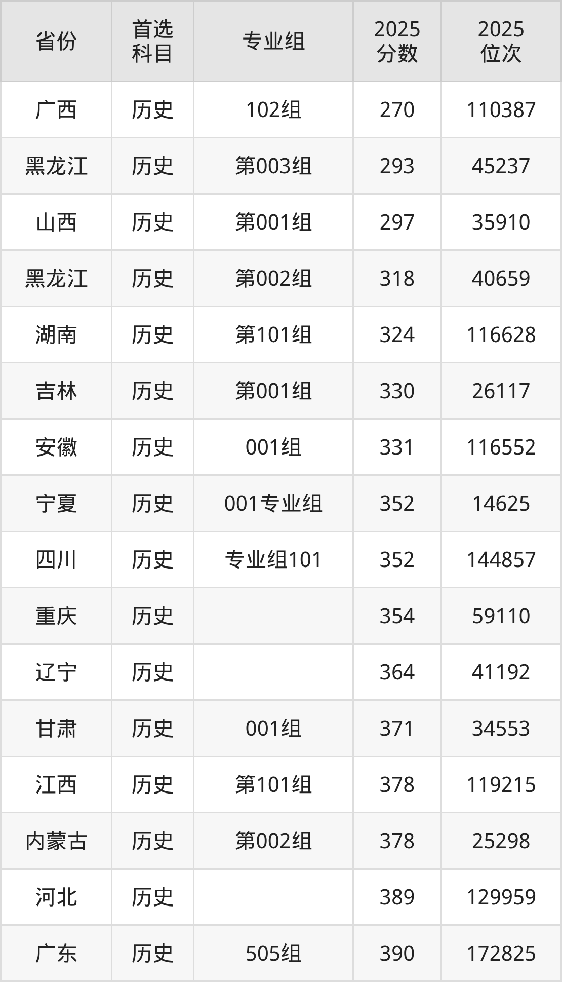 历史类最低分对应地区为广西(102组),录取位次为110387;最高分对应地区为广东(506组),录取位次为148054,超专科线197分。