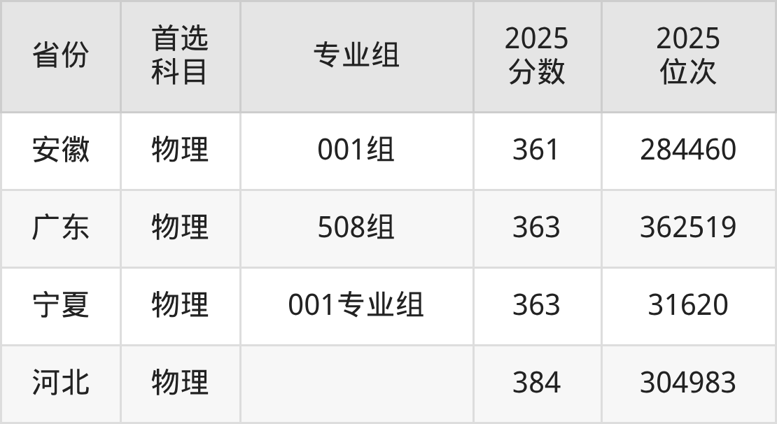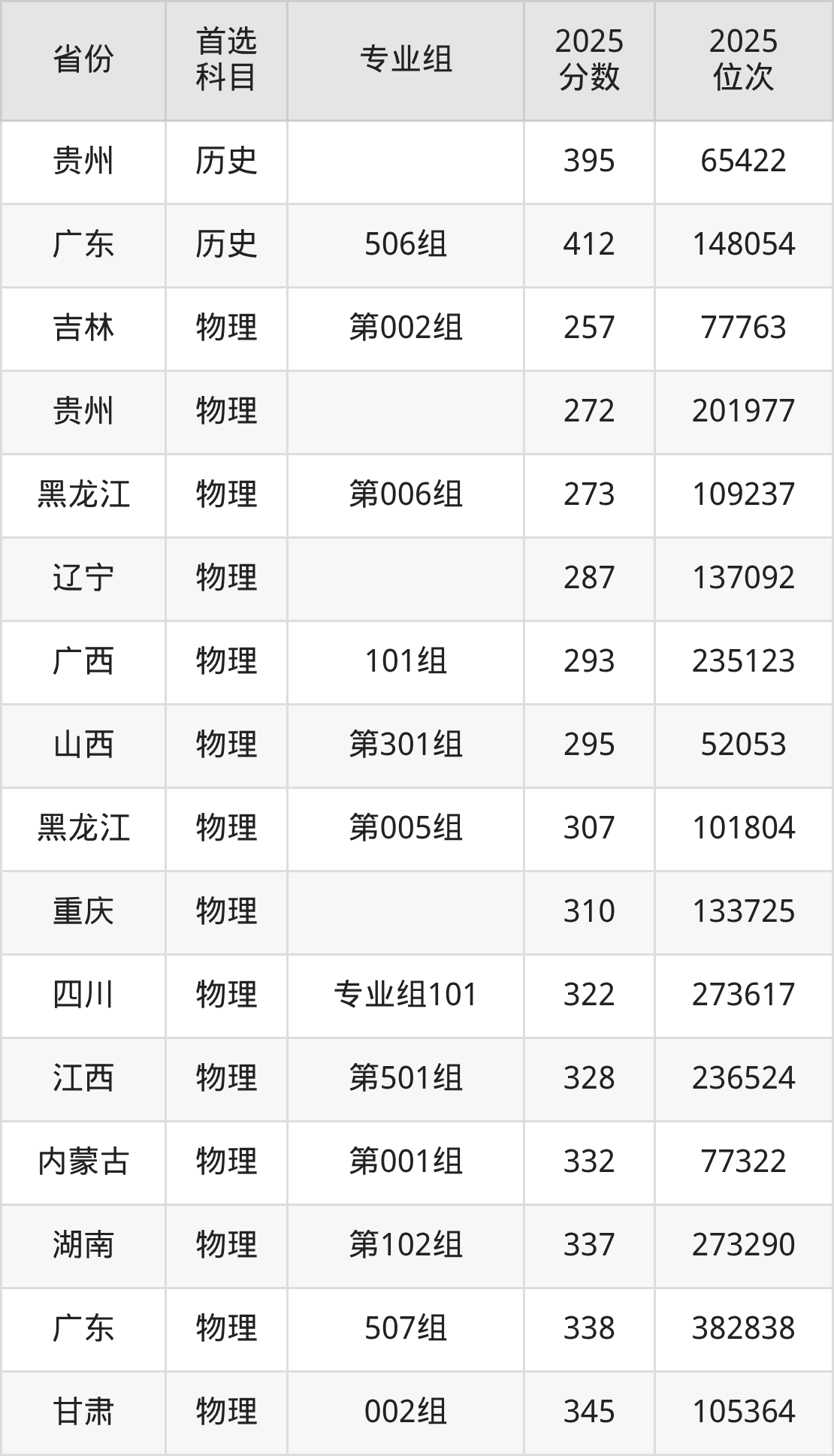 物理类最低分对应地区为吉林(第002组),录取位次为77763,超专科线97分;最高分对应地区为河北,录取位次为304983,超专科线184分。