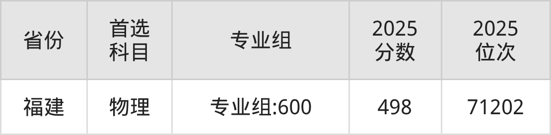 物理类最低分对应地区为福建(专业组:600),录取位次为71202,超本科线57分。
