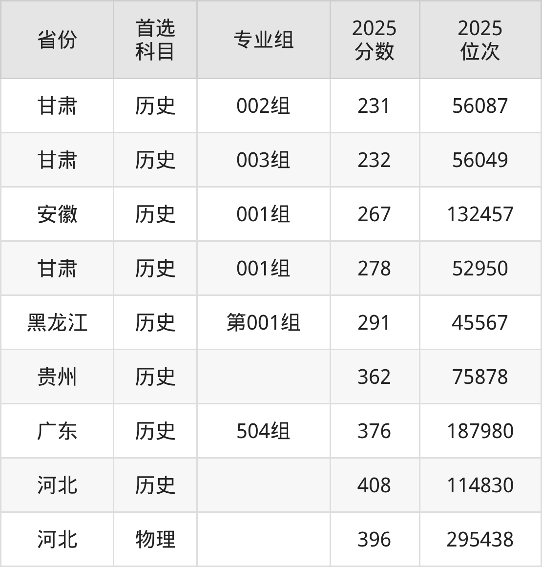 历史类最低分对应地区为甘肃(002组),录取位次为56087,超专科线71分;最高分对应地区为河北,录取位次为114830,超专科线208分。