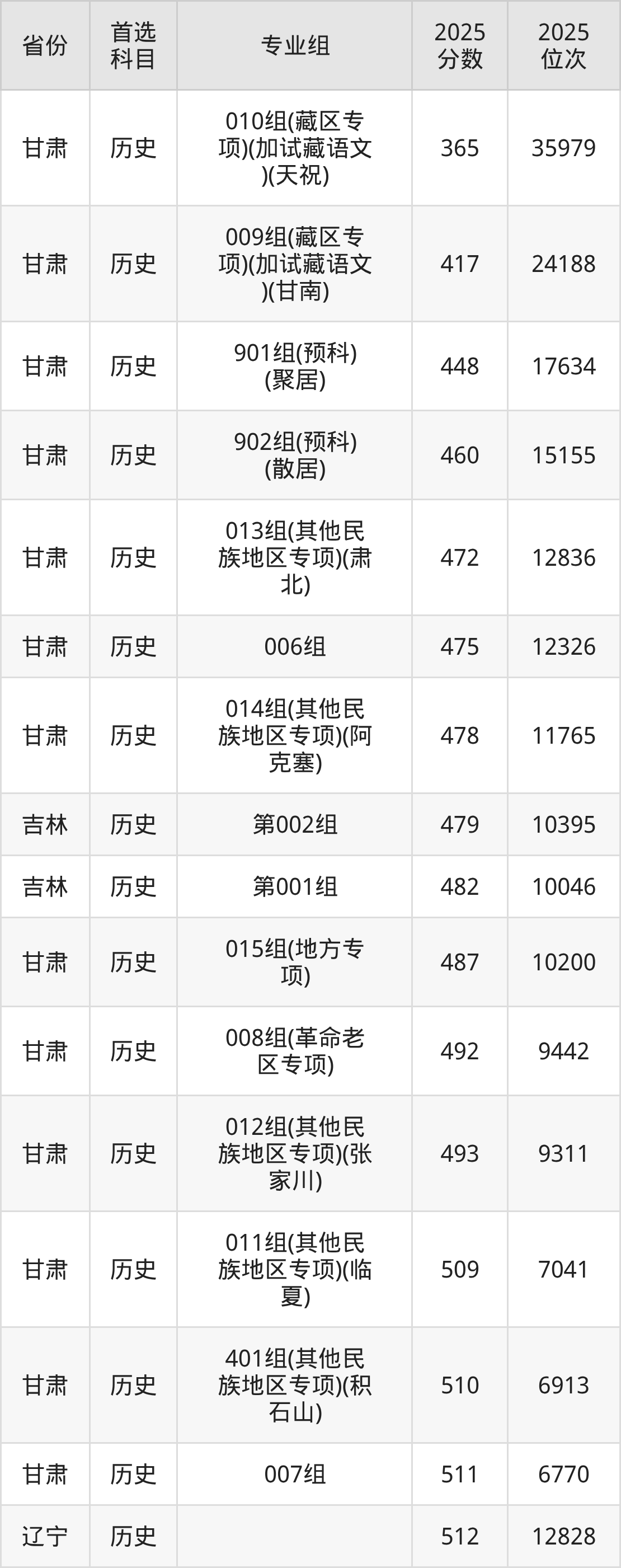历史类:005组515分、6237名,006组475分、12326名,007组511分、6770名,008组(革命老区专项)492分、9442名,009组(藏区专项)(加试藏语文)(甘南)417分、24188名,010组(藏区专项)(加试藏语文)(天祝)365分、35979名,011组(其他民族地区专项)(临夏)509分、7041名,012组(其他民族地区专项)(张家川)493分、9311名,013组(其他民族地区专项)(肃北)472分、12836名,014组(其他民族地区专项)(阿克塞)478分、11765名,015组(地方专项)487分、10200名,401组(其他民族地区专项)(积石山)510分、6913名,901组(预科)(聚居)448分、17634名,902组(预科)(散居)460分、15155名;