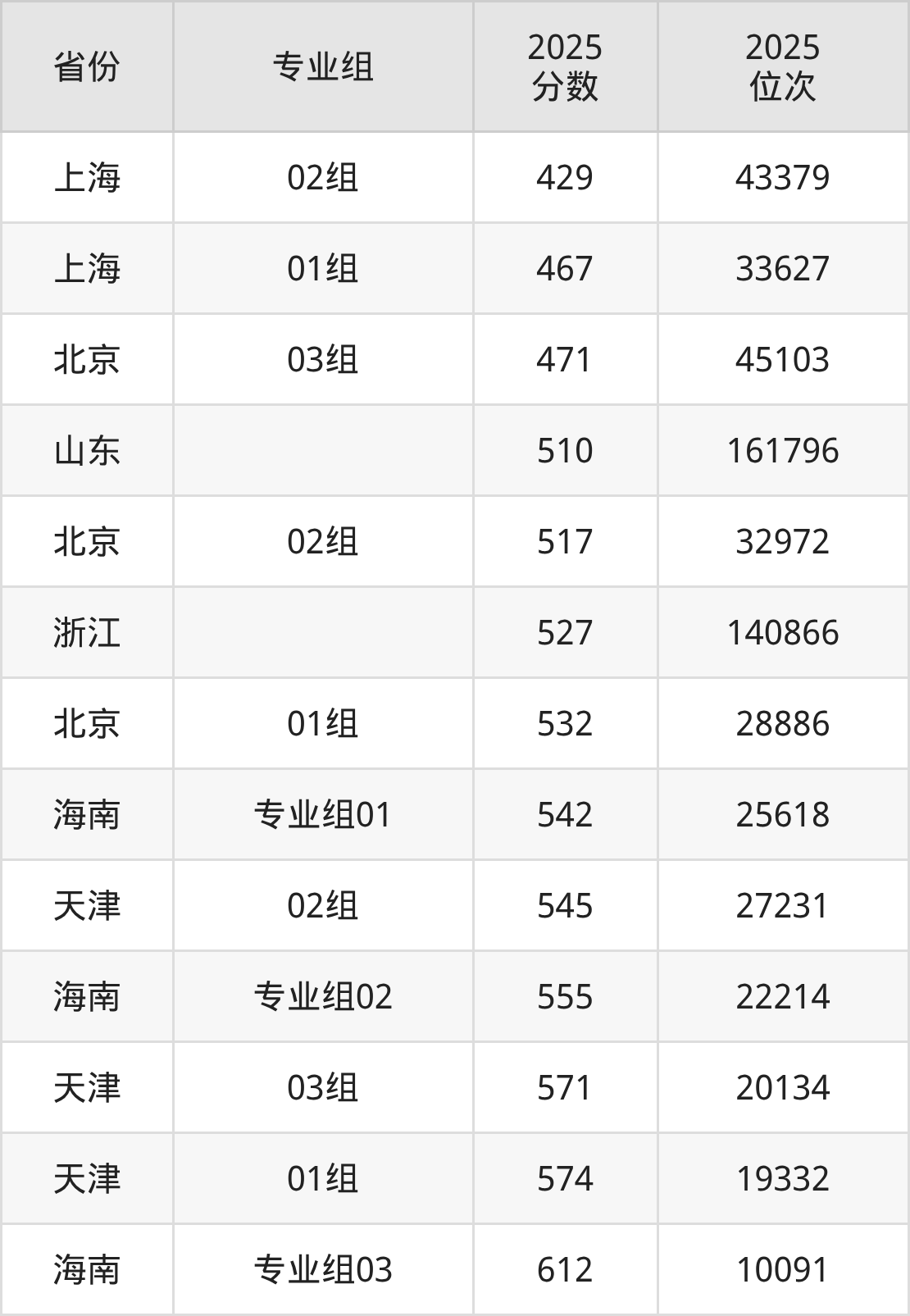 最低分对应地区为上海(02组),录取位次为43379,超本科线27分;最高分对应地区为海南(专业组03),录取位次为10091,超本科线132分。