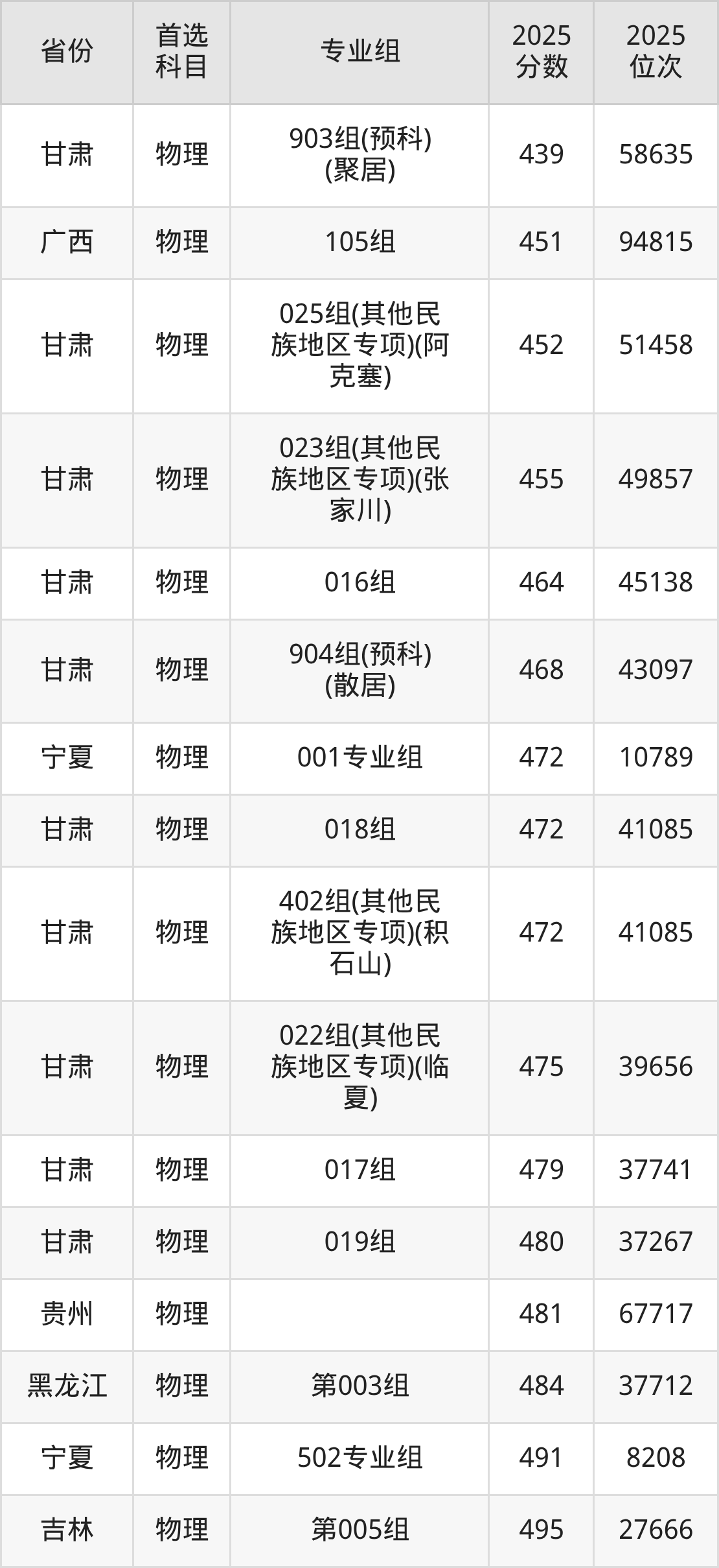 物理类:016组464分、45138名,017组479分、37741名,018组472分、41085名,019组480分、37267名,020组(藏区专项)(加试藏语文)(甘南)379分、91426名,021组(藏区专项)(加试藏语文)(天祝)313分、113554名,022组(其他民族地区专项)(临夏)475分、39656名,023组(其他民族地区专项)(张家川)455分、49857名,024组(其他民族地区专项)(肃北)432分、62505名,025组(其他民族地区专项)(阿克塞)452分、51458名,402组(其他民族地区专项)(积石山)472分、41085名,903组(预科)(聚居)439分、58635名,904组(预科)(散居)468分、43097名;
