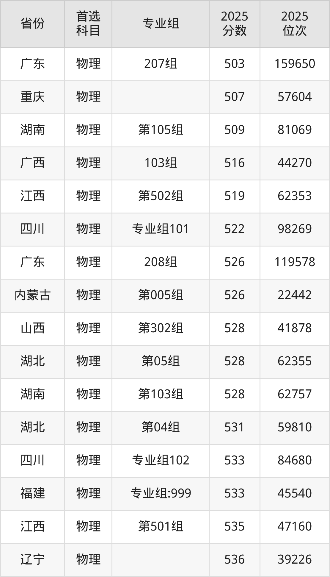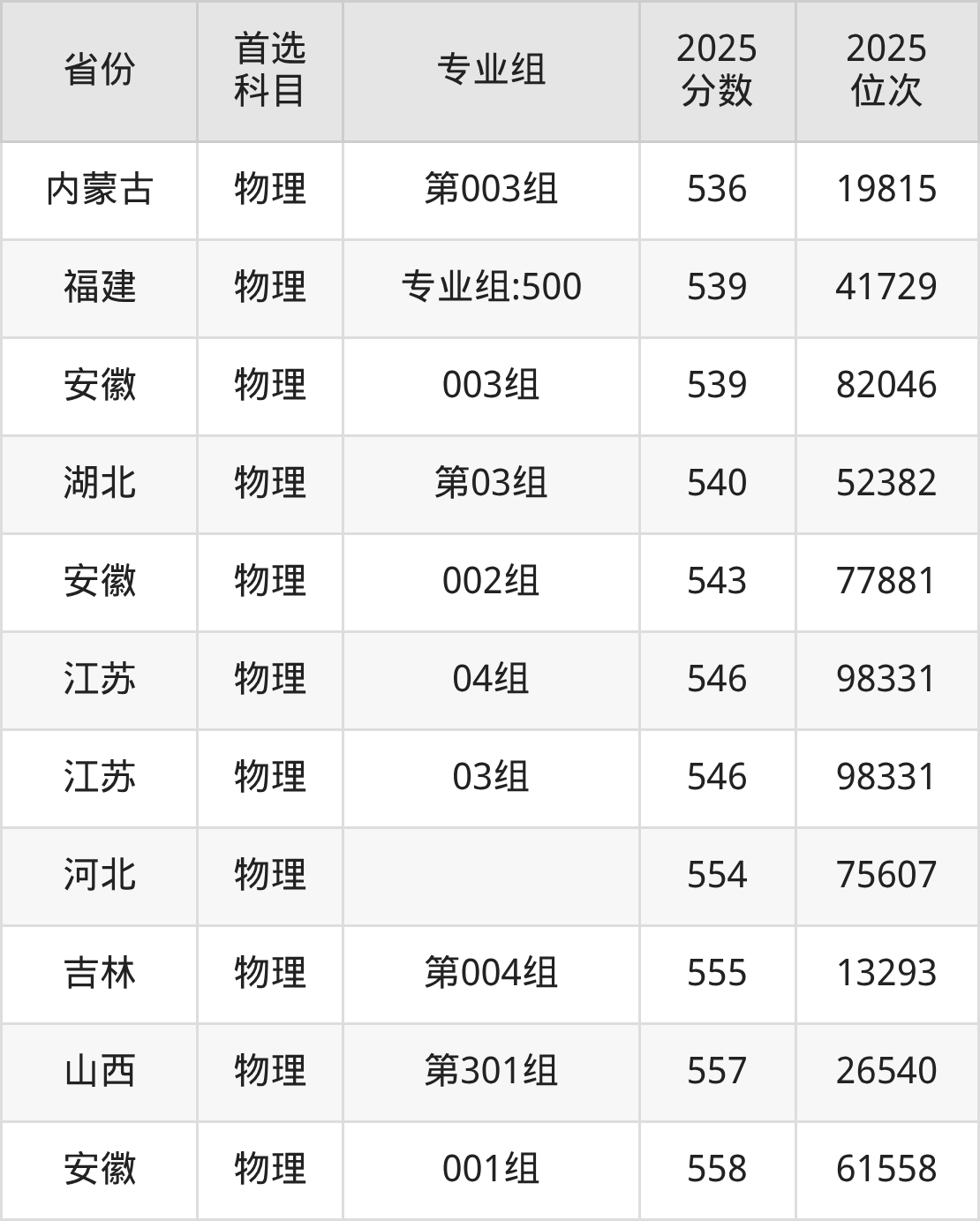 物理类最低分对应地区为甘肃(021组(藏区专项)(加试藏语文)(天祝)),录取位次为113554,低本科线61分;最高分对应地区为安徽(001组),录取位次为61558,超本科线97分。