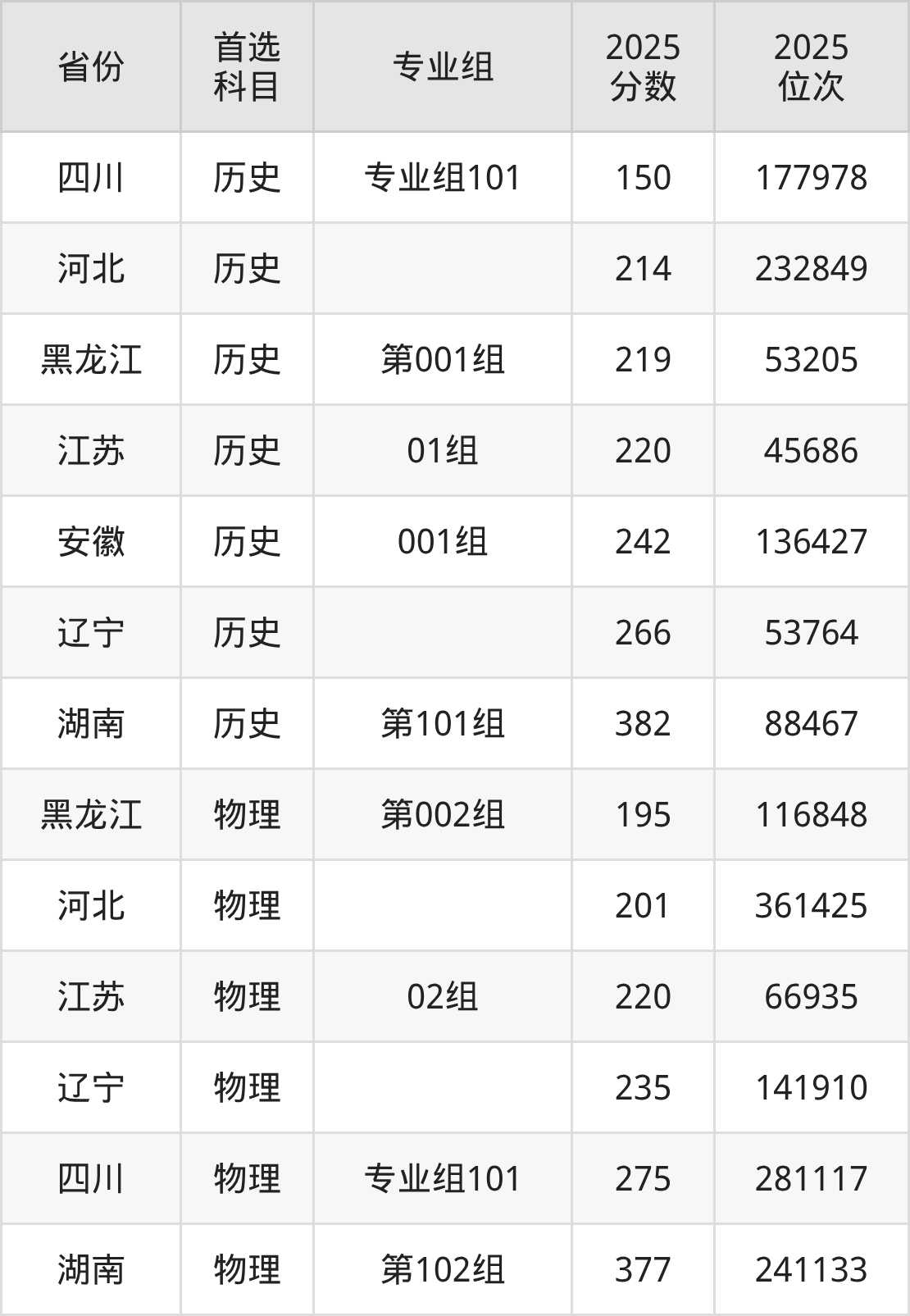 历史类最低分对应地区为四川(专业组101),录取位次为177978;最高分对应地区为湖南(第101组),录取位次为88467,超专科线182分。