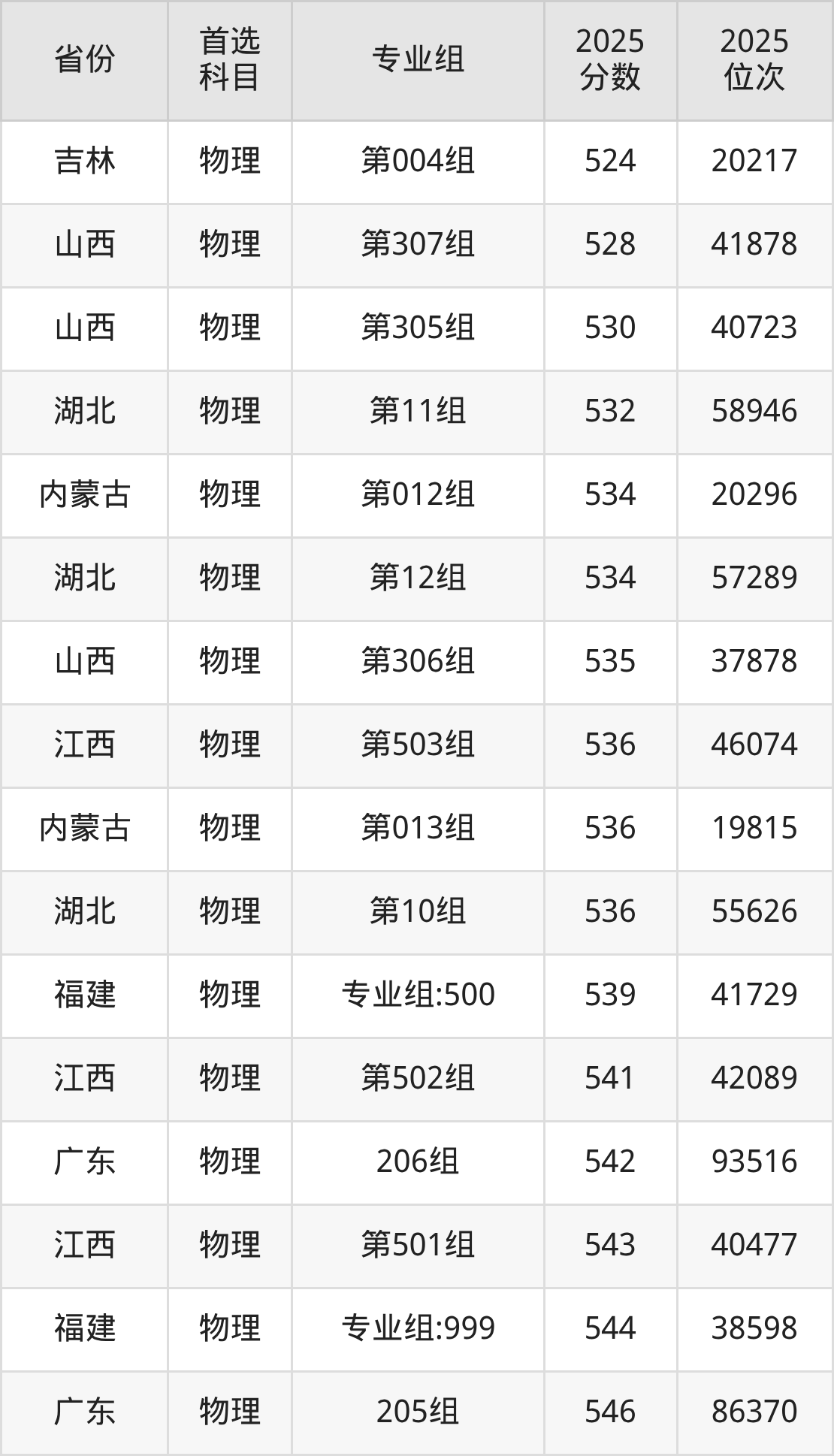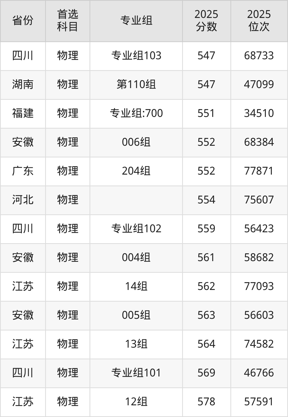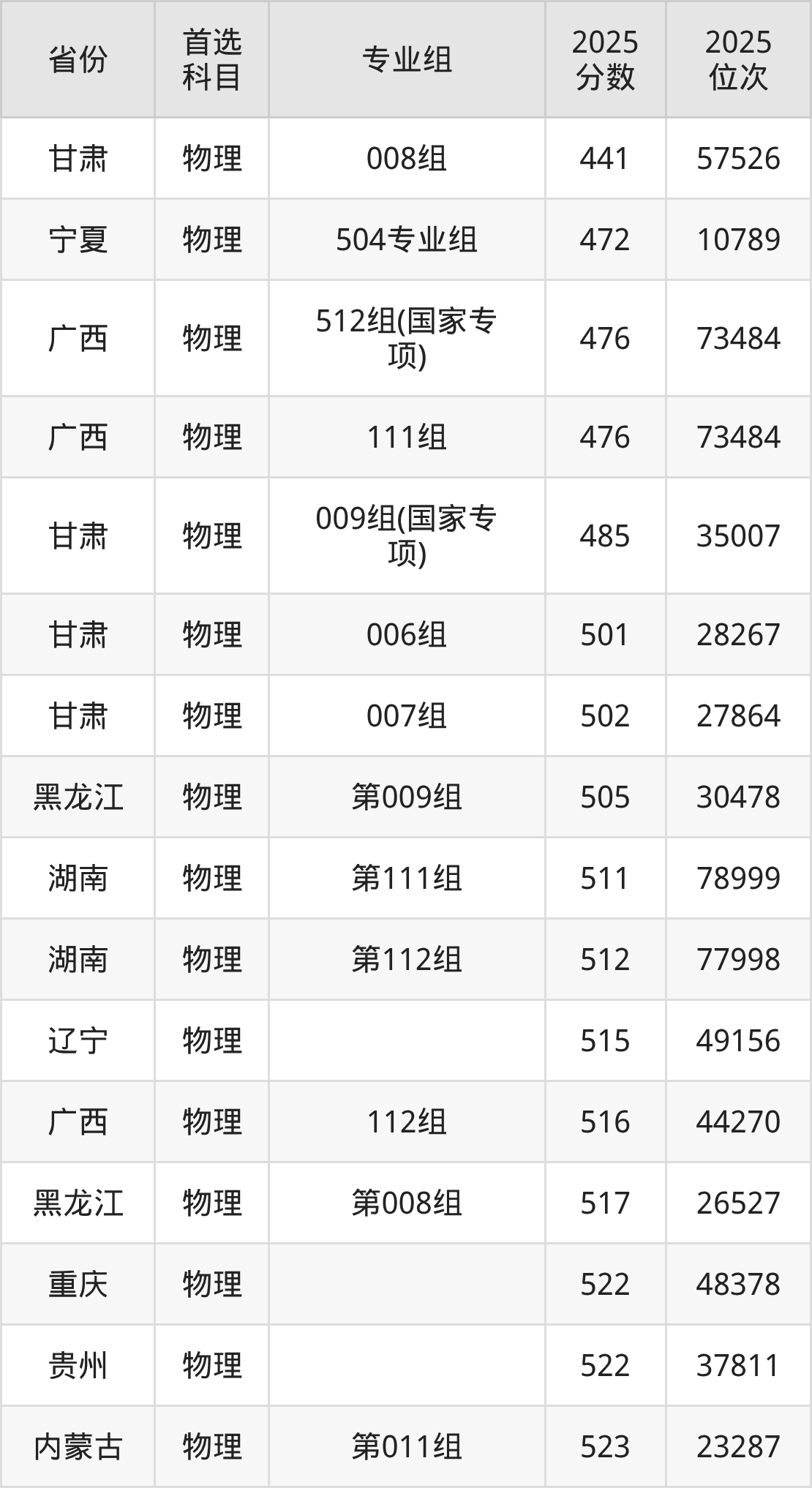 物理类最低分对应地区为甘肃(008组),录取位次为57526,超本科线67分;最高分对应地区为江苏(12组),录取位次为57591,超本科线115分。