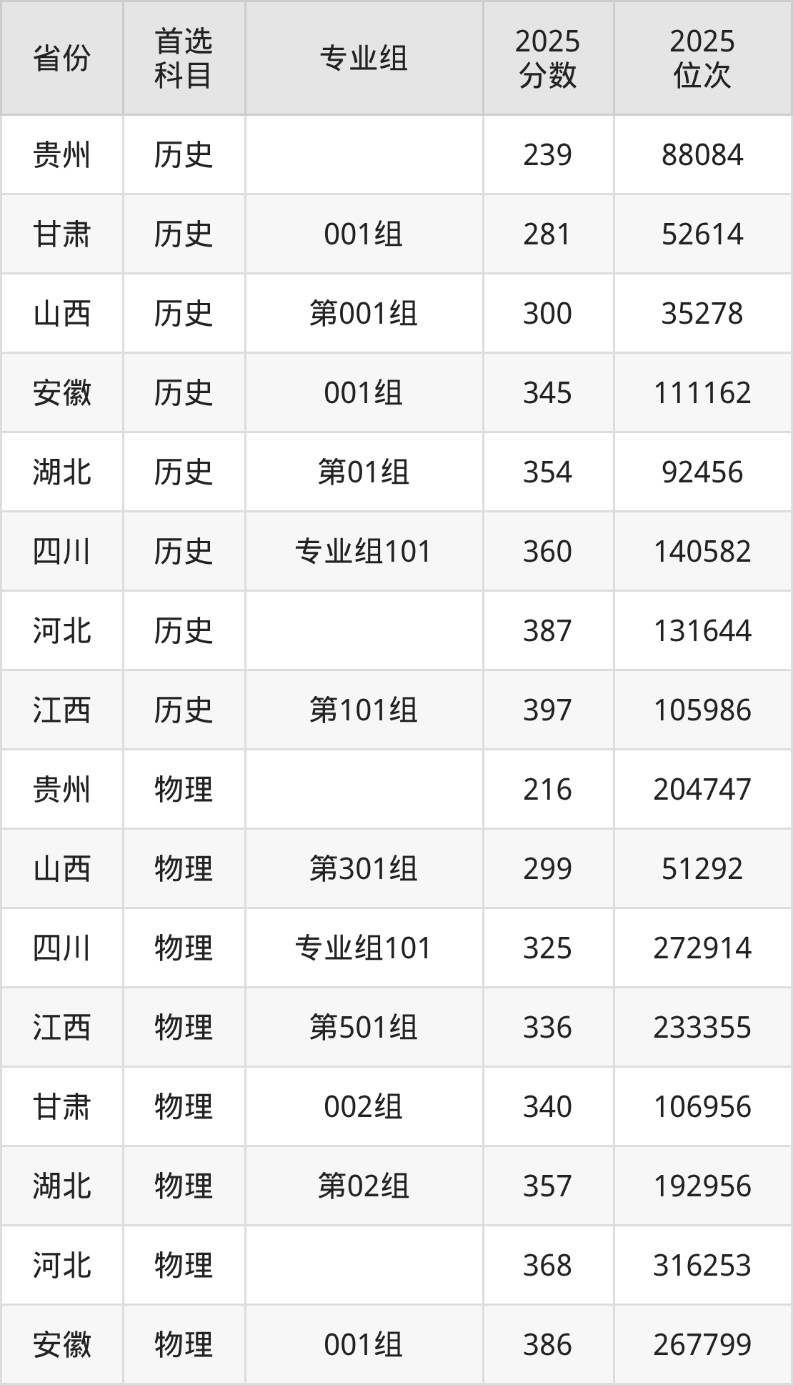 历史类最低分对应地区为贵州,录取位次为88084,超专科线59分;最高分对应地区为江西(第101组),录取位次为105986,超专科线107分。