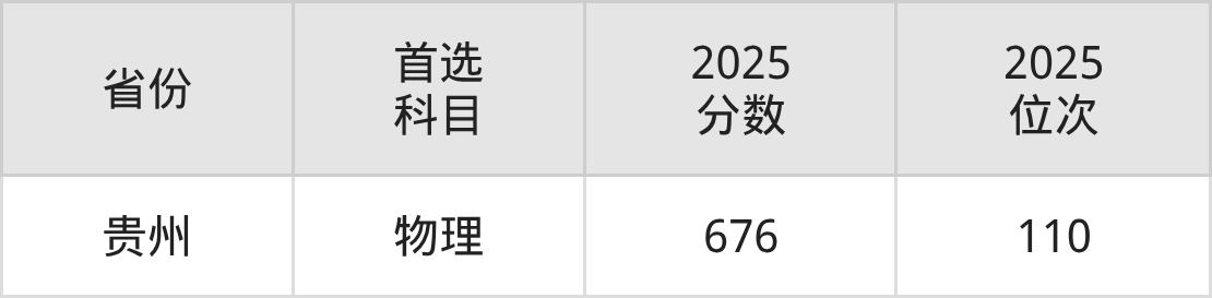 物理类最低分对应地区为贵州,录取位次为110,超本科线289分。