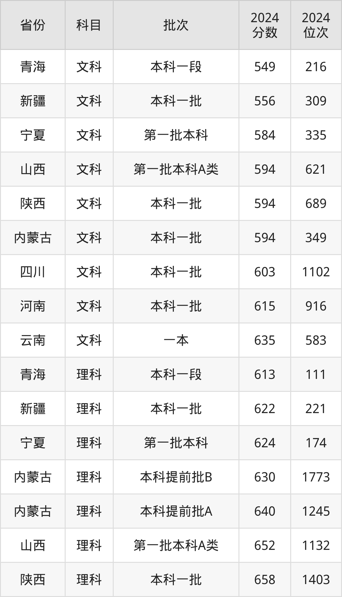文科最低分对应地区为青海,录取位次为216,超一本线138分;最高分对应地区为云南,录取位次为583,超一本线85分。