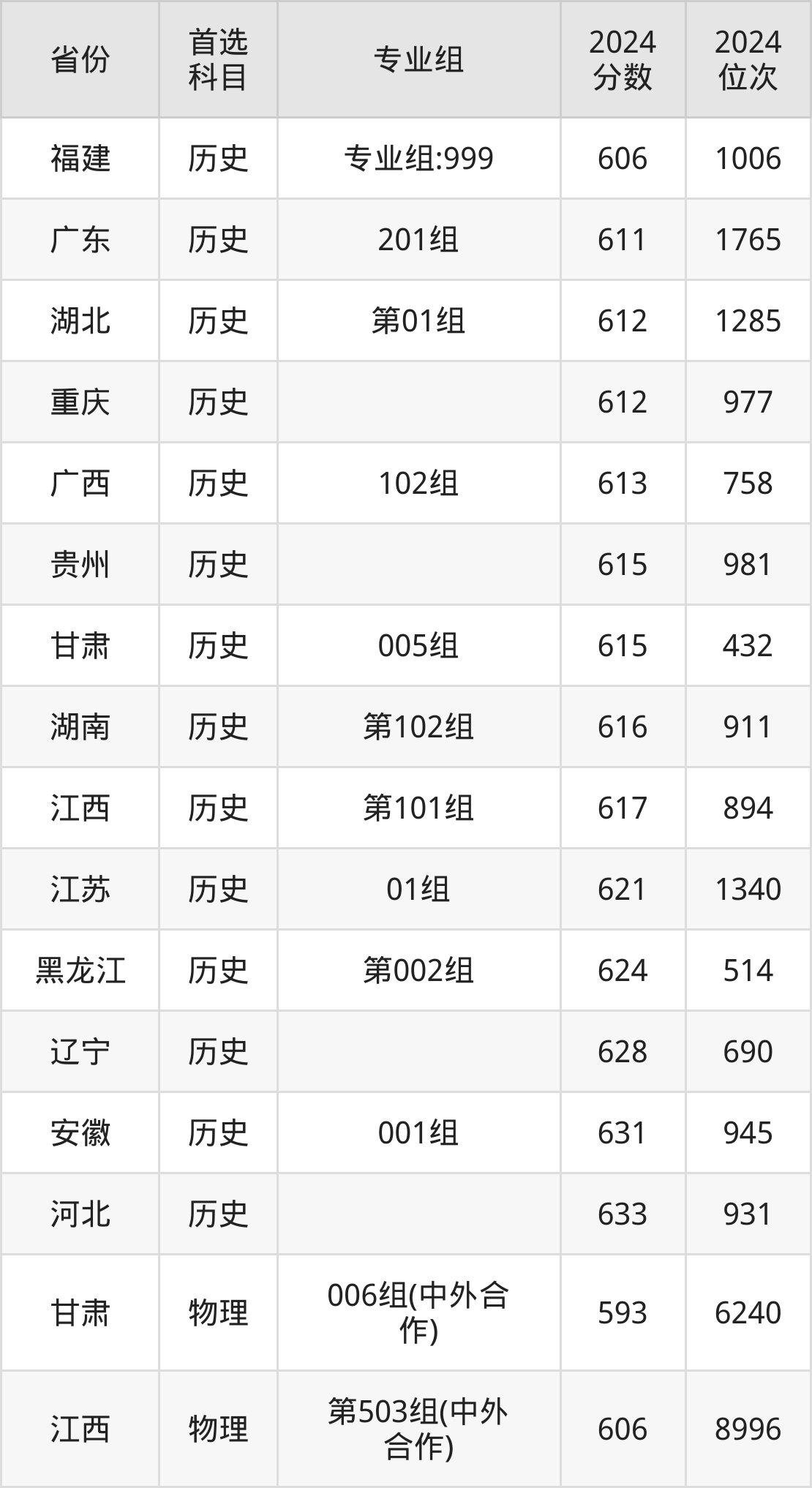 历史类最低分对应地区为福建(专业组:999),录取位次为1006,超本科线175分;最高分对应地区为河北,录取位次为931,超本科线184分。