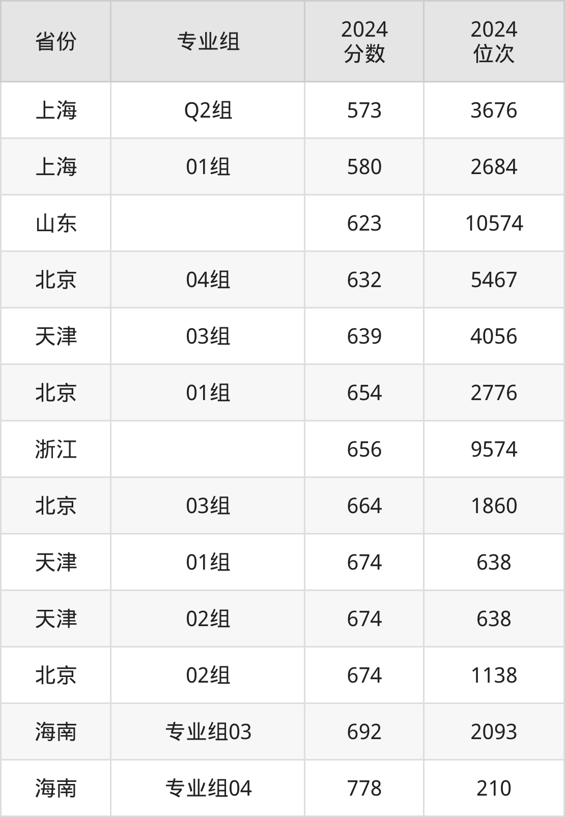 最低分对应地区为上海(Q2组),录取位次为3676,超本科线170分;最高分对应地区为海南(专业组04),录取位次为210,超本科线295分。