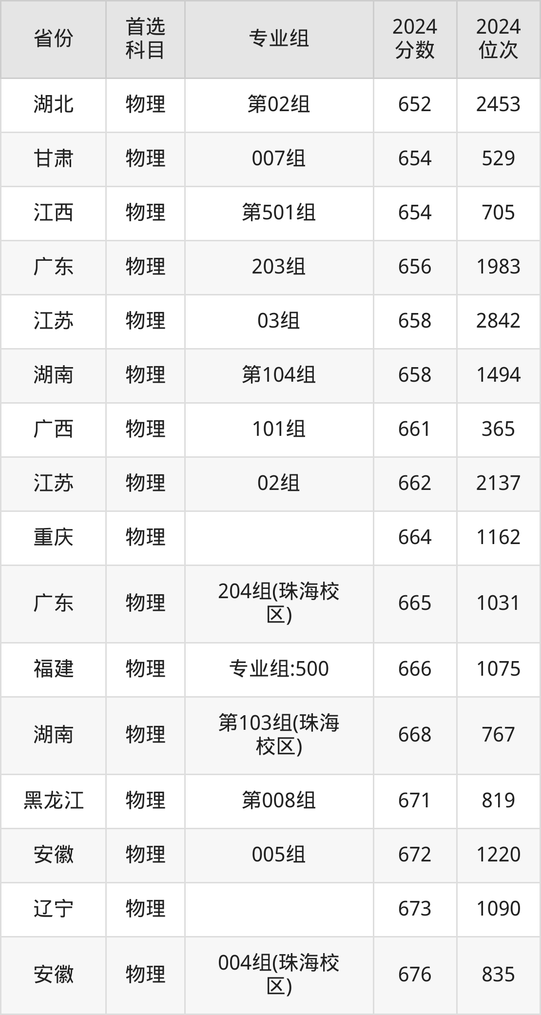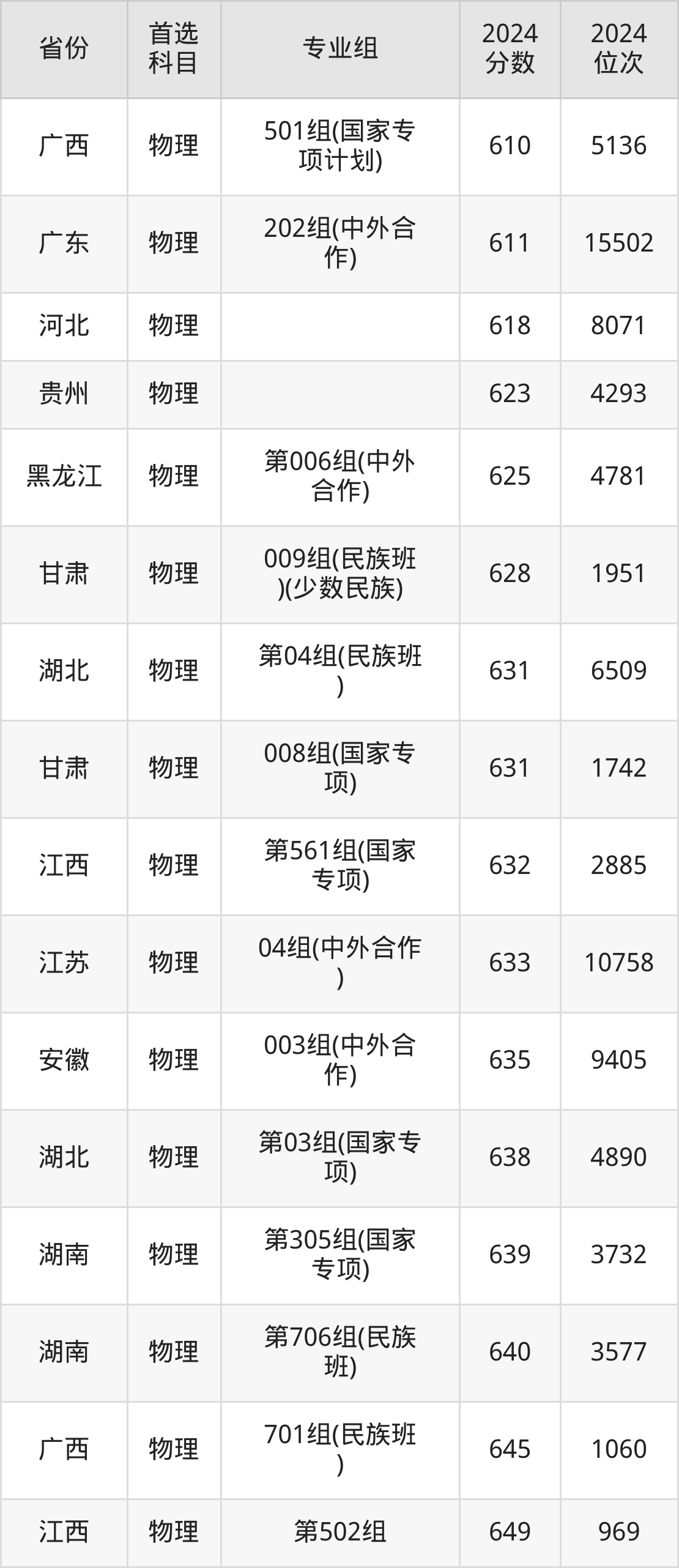 物理类最低分对应地区为甘肃(006组(中外合作)),录取位次为6240,超本科线223分;最高分对应地区为黑龙江(第007组),录取位次为429,超本科线321分。
