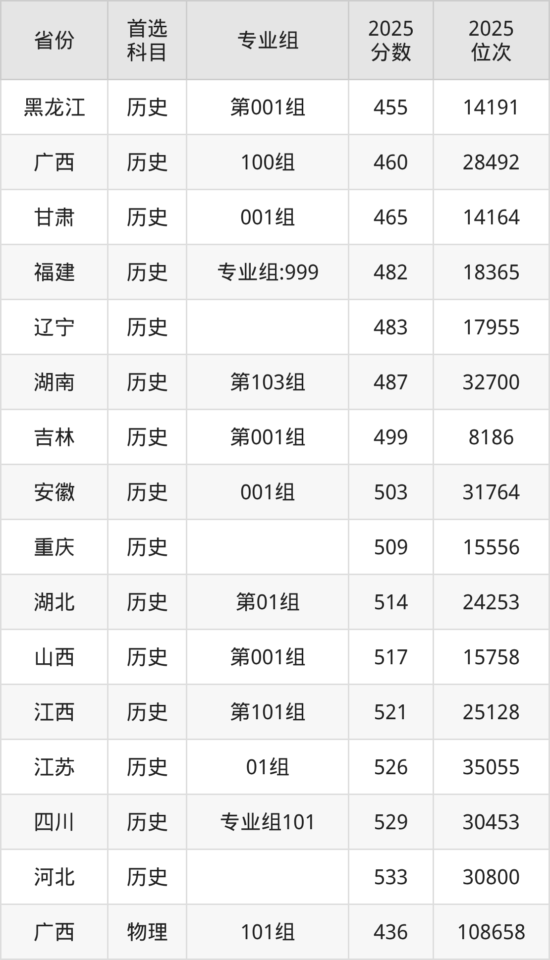 历史类最低分对应地区为黑龙江(第001组),录取位次为14191;最高分对应地区为河北,录取位次为30800,超本科线56分。