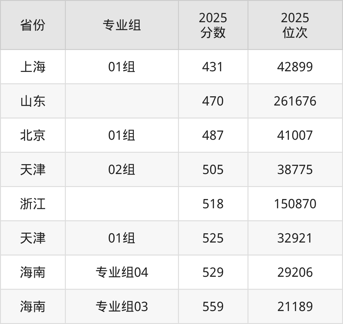 最低分对应地区为上海(01组),录取位次为42899,超本科线29分;最高分对应地区为海南(专业组03),录取位次为21189,超本科线79分。