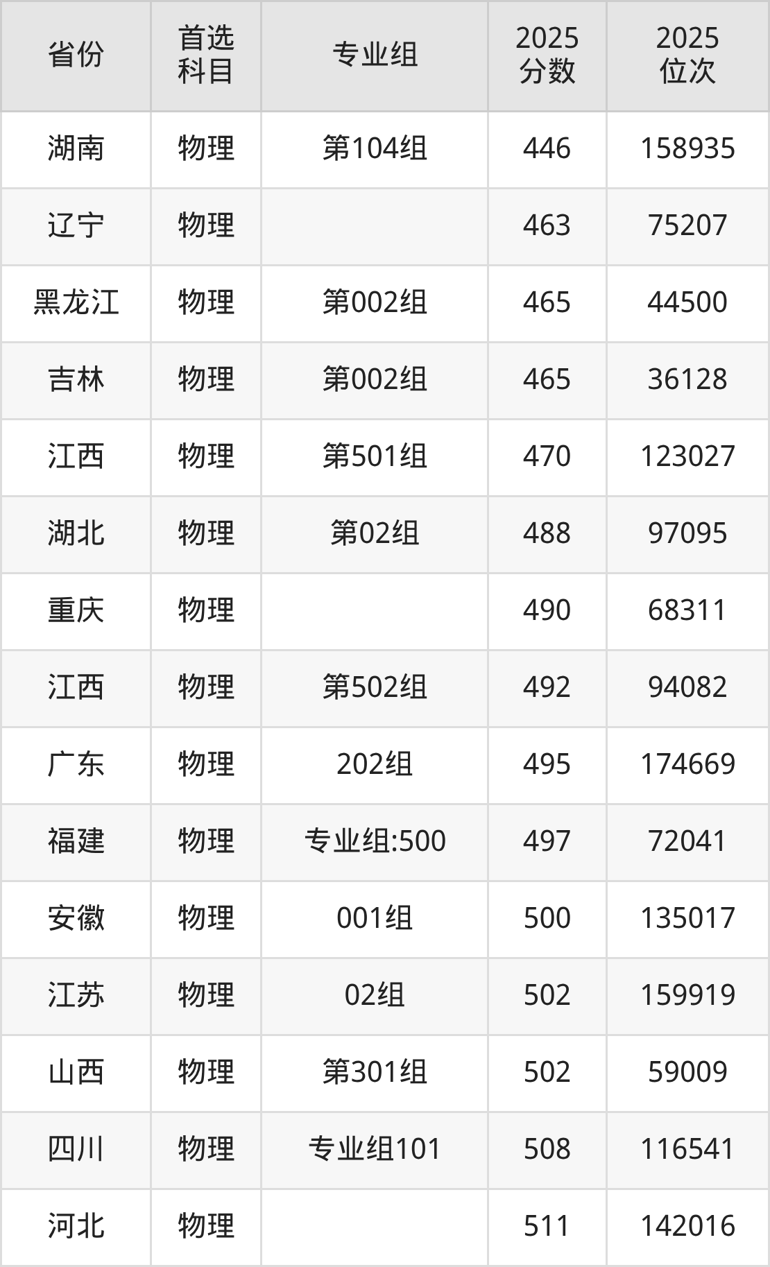 物理类最低分对应地区为广西(101组),录取位次为108658,超本科线66分;最高分对应地区为河北,录取位次为142016,超本科线56分。