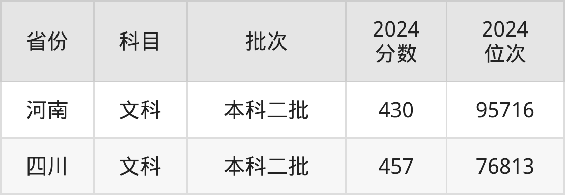 文科最低分对应地区为河南,录取位次为95716,超二本线2分;最高分对应地区为四川,录取位次为76813,超二本线0分。