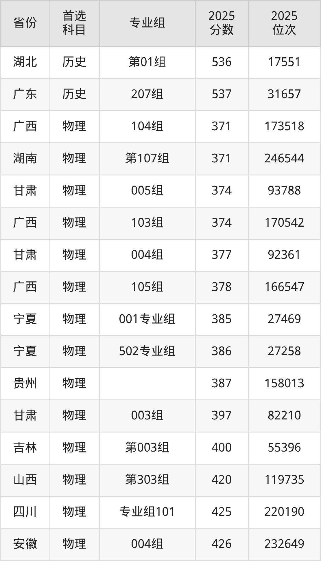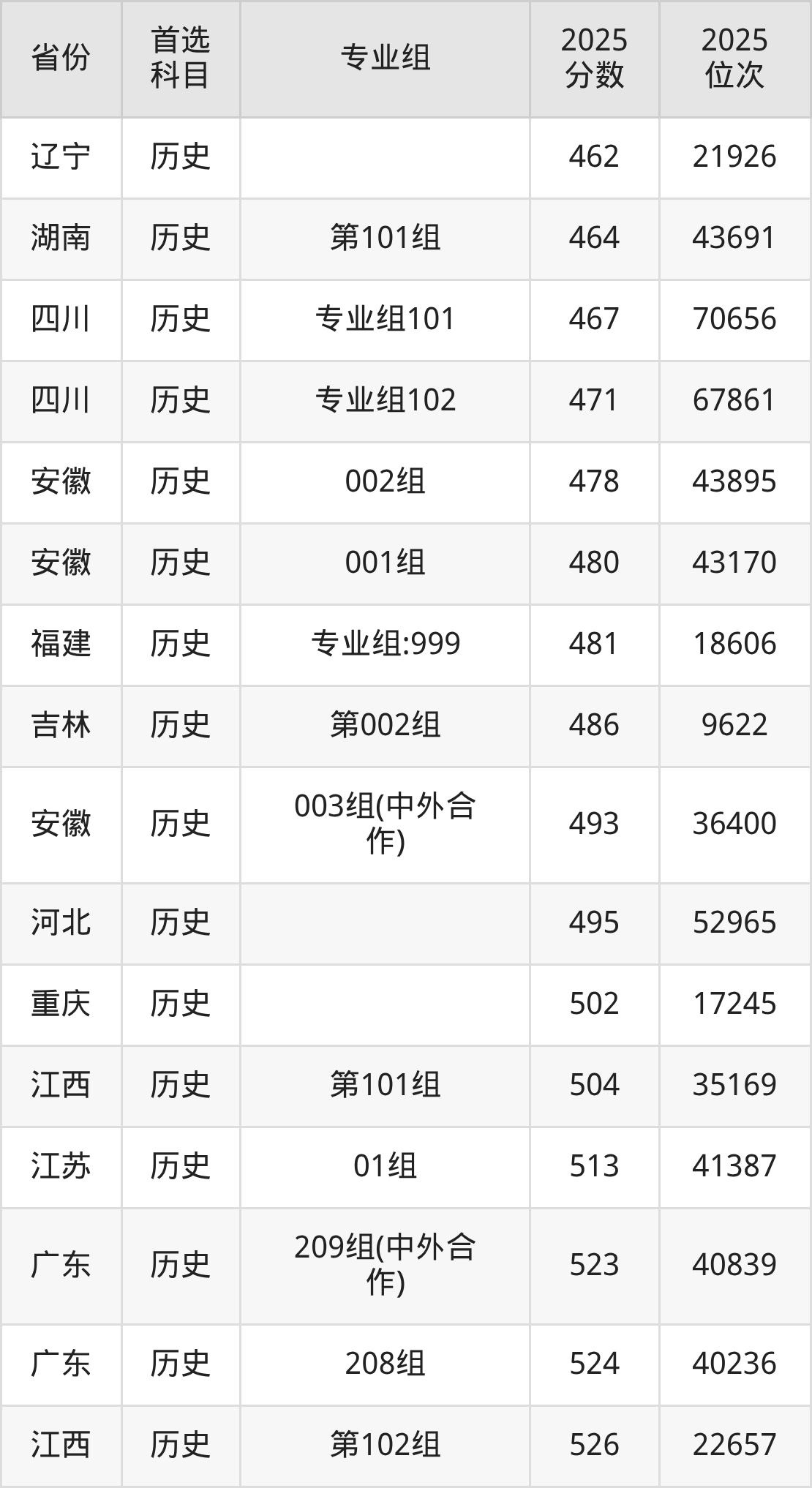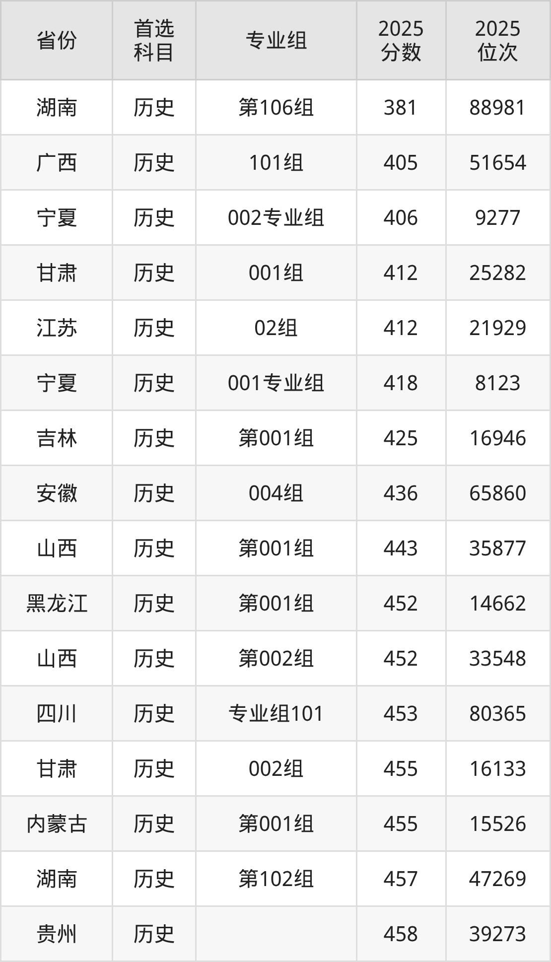 历史类最低分对应地区为湖南(第106组),录取位次为88981,超专科线181分;最高分对应地区为广东(207组),录取位次为31657,超本科线73分。