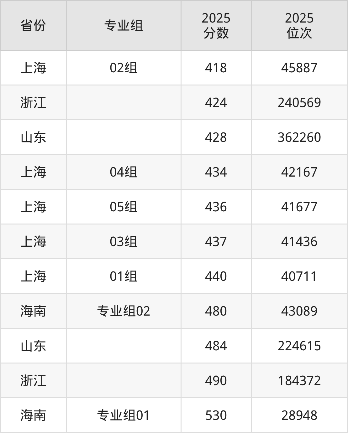 最低分对应地区为上海(02组),录取位次为45887,超本科线16分;最高分对应地区为海南(专业组01),录取位次为28948。