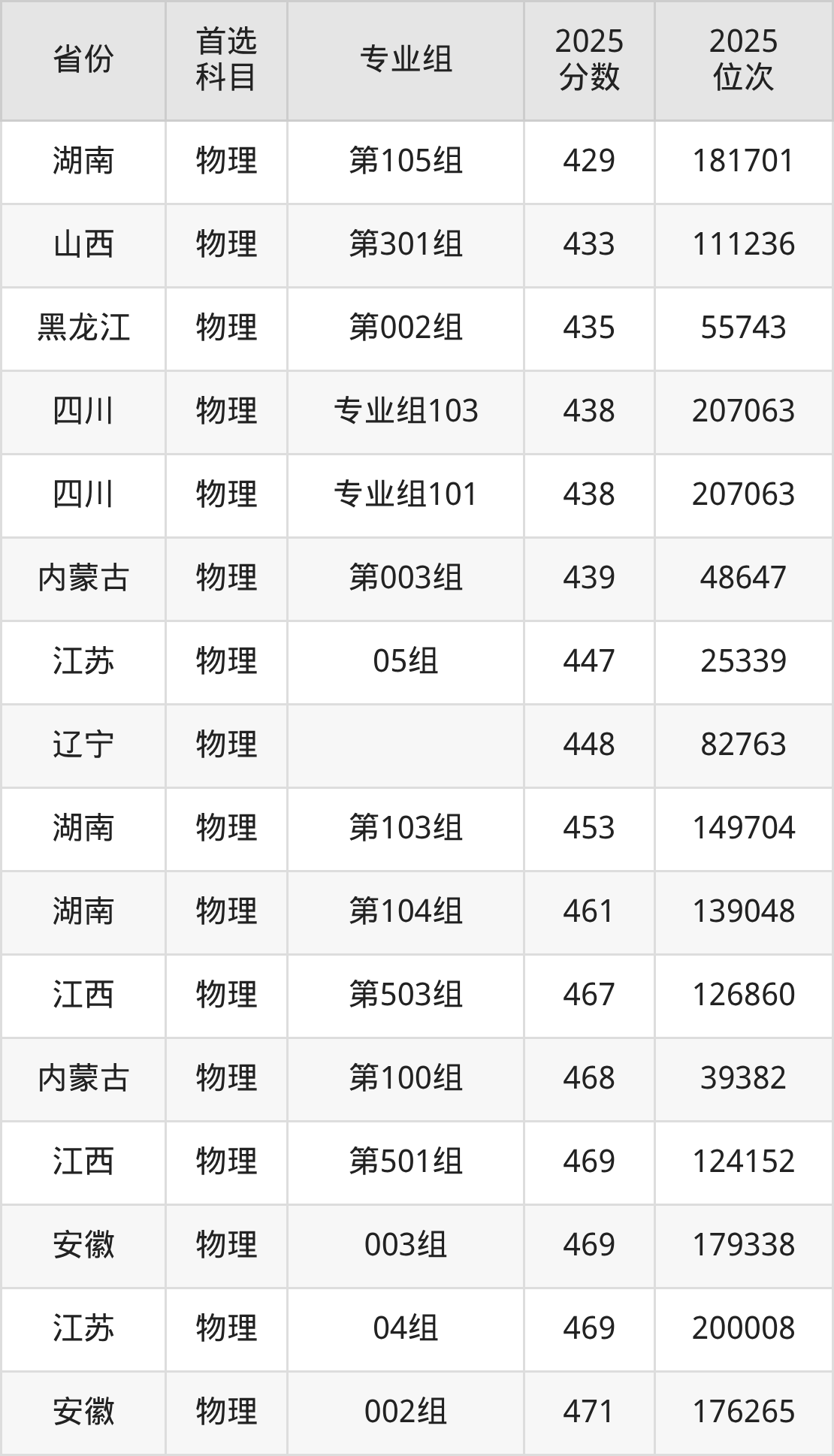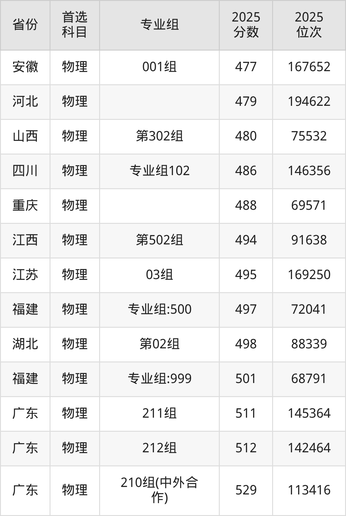 物理类最低分对应地区为广西(104组),录取位次为173518,超本科线1分;最高分对应地区为广东(210组(中外合作)),录取位次为113416,超本科线93分。