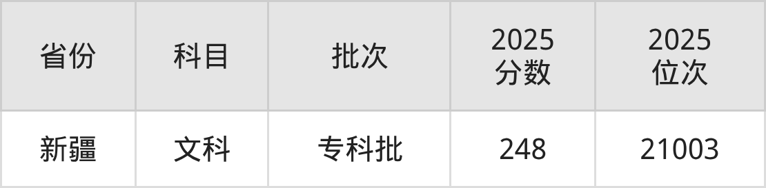 文科最低分对应地区为新疆,录取位次为21003,超专科线108分。