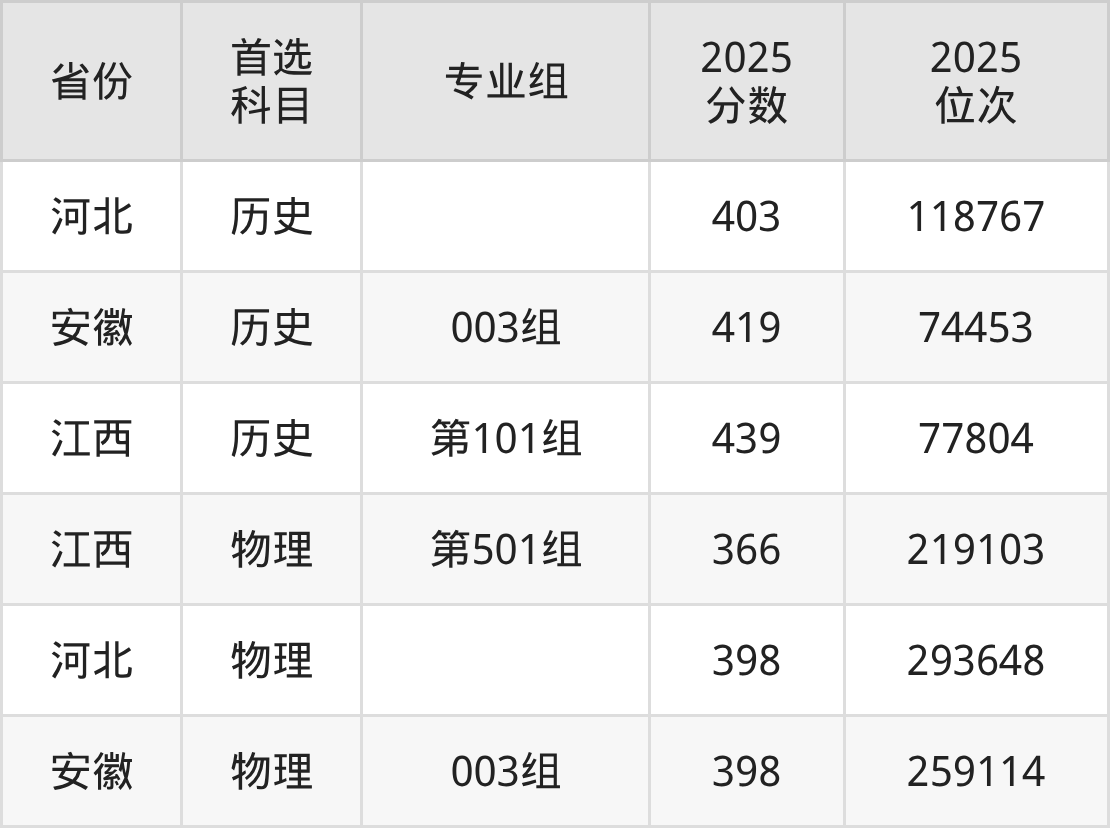 历史类最低分对应地区为河北,录取位次为118767,超专科线203分;最高分对应地区为江西(第101组),录取位次为77804,超专科线149分。