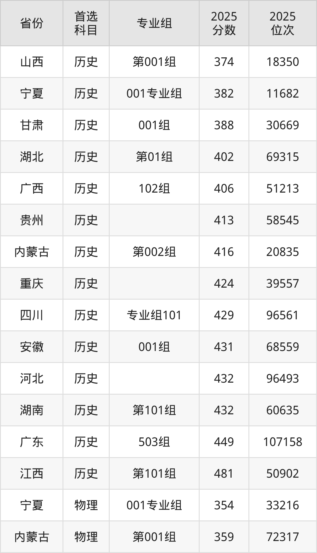 历史类最低分对应地区为山西(第001组),录取位次为18350,超专科线274分;最高分对应地区为江西(第101组),录取位次为50902,超专科线191分。