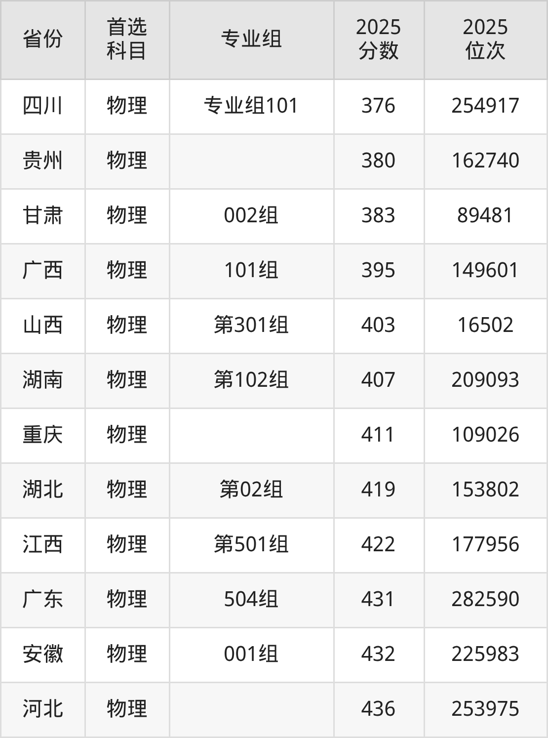 物理类最低分对应地区为宁夏(001专业组),录取位次为33216,超专科线204分;最高分对应地区为河北,录取位次为253975,超专科线236分。