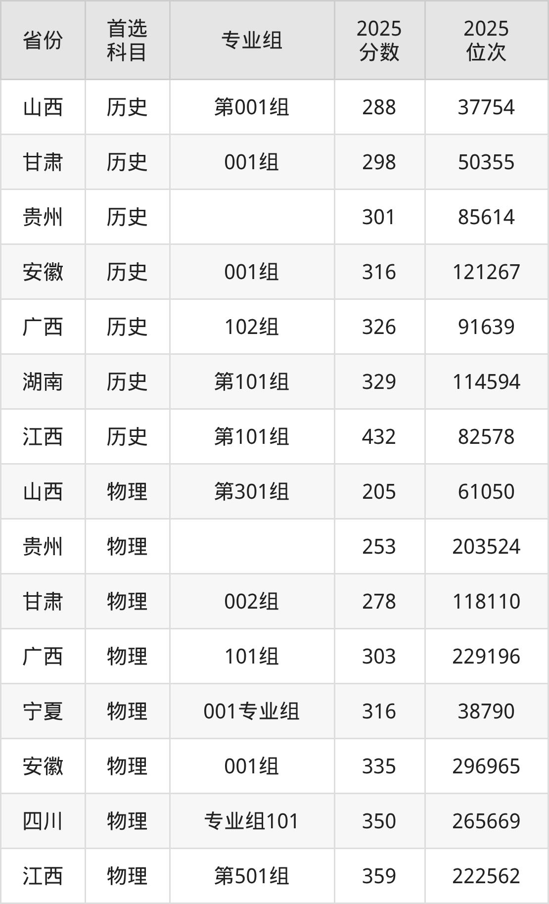 物理类最低分对应地区为山西(第301组),录取位次为61050,超专科线105分;最高分对应地区为江西(第501组),录取位次为222562,超专科线119分。
